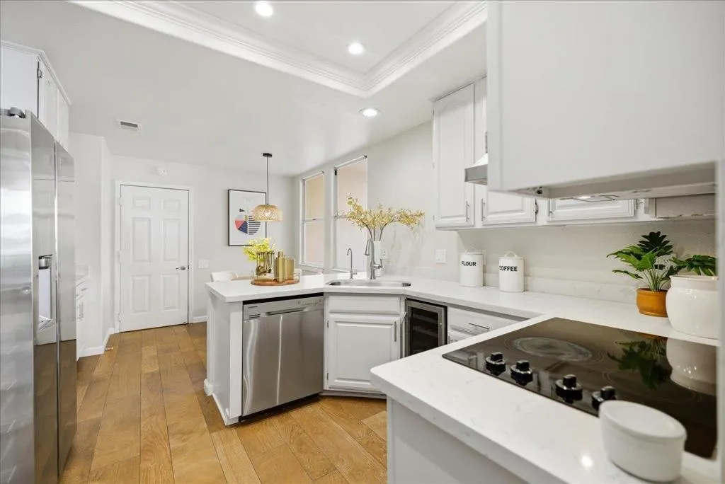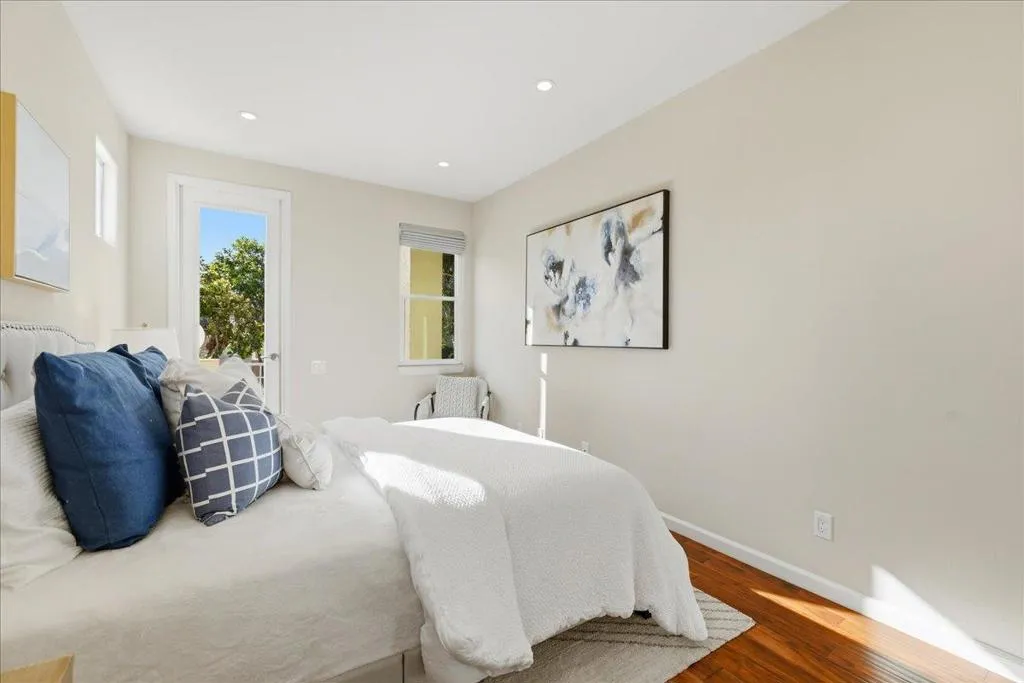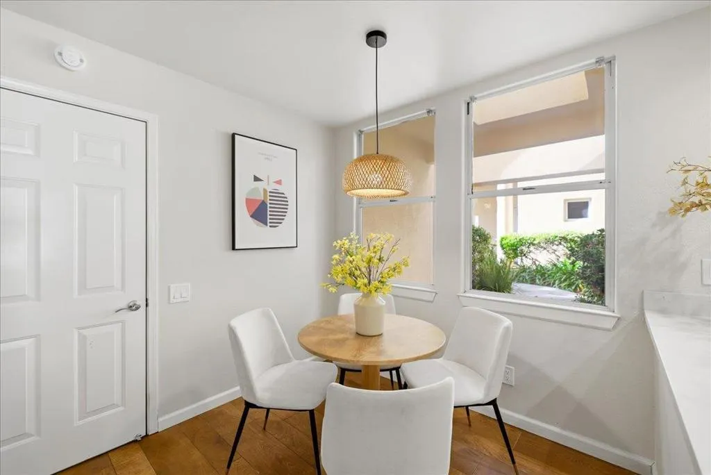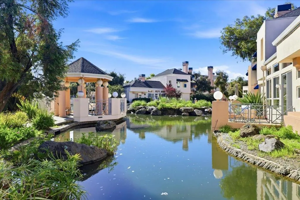 Beautifully situated in the desirable Lakeshore community of Redwood Shores, this bright and spacious corner-unit townhome offers approximately 1,996 sq ft of comfortable living space with 3 bedrooms and 2.5 bathrooms. The inviting living room opens to a private patio overlooking a tranquil waterway, creating a peaceful setting for relaxing or entertaining. The well-appointed kitchen features quartz countertops, stainless steel appliances, recessed lighting, and a charming breakfast area. Dramatic high ceilings and a striking spiral staircase enhance the homes open and airy feel while allowing abundant natural light throughout. Upstairs, the generous primary suite offers a walk-in closet and an updated bathroom with a frameless glass shower and soaking tub. Two additional bedrooms share access to a balcony, providing a pleasant outdoor retreat. Hardwood flooring throughout the whole property, in-unit laundry room, and attached two-car garage. Ideally located near scenic waterfront trails, parks, shopping, and major commute routes, and within a highly regarded school district. Enjoy the relaxed waterfront lifestyle that makes Redwood Shores one of the Peninsulas most desirable communities.