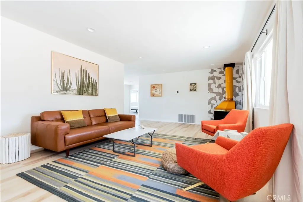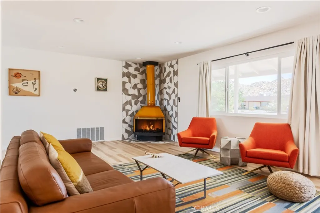 Set against the rugged hills and open desert skies of Joshua Tree, this updated home offers a comfortable high desert setting with space to relax and enjoy the outdoors. The backyard is designed for desert living, featuring a private pool and spa, a spacious concrete deck for lounging, and a fire pit area that’s perfect for evenings under the stars. The surrounding landscape and nearby boulder hills create a scenic backdrop that feels distinctly Joshua Tree. Inside, the home has been refreshed with a clean, modern aesthetic. The remodeled kitchen features stone counters, stainless steel appliances, and generous cabinetry, opening to the dining area with large windows and sliding doors that connect easily to the backyard patio. The living room centers around a distinctive freestanding fireplace with a geometric tile surround, creating a comfortable focal point for the space. Additional highlights include recessed lighting, updated flooring, and owned solar. The layout flows easily between indoor and outdoor spaces, making the home well suited for everyday living, entertaining, or weekend escapes. Located in the unincorporated community of Joshua Tree, the property is within easy reach of Joshua Tree National Park, the shops and restaurants of Joshua Tree Village, and the weekly farmers market. Pioneertown and Pappy & Harriet’s are also a short drive away, along with hiking trails and open desert landscapes throughout the Morongo Basin.