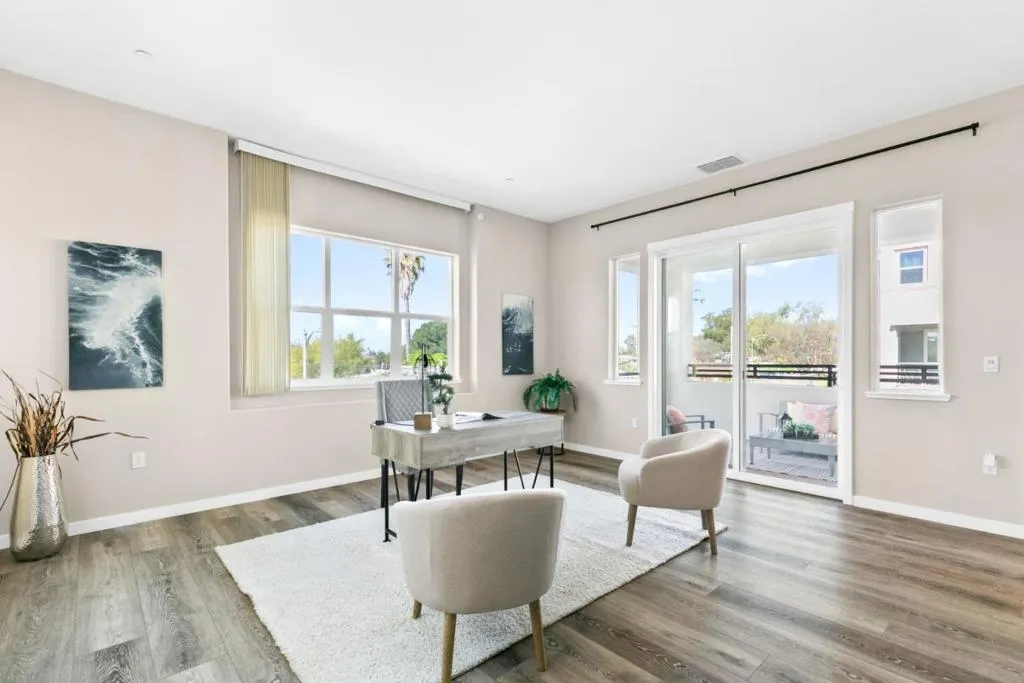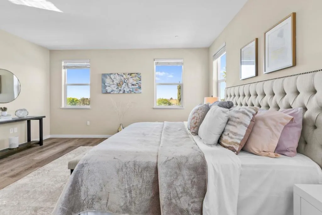 This gorgeous 3,090 sqft single-family home, built in 2019, is located on a desirable corner lot in the prestigious Asana community. It features 3 spacious bedrooms, 2 full baths, and 2 half baths. A versatile room on the first or second floor can be used as a living room, home office, guest room, or for many other purposes. The contemporary open floor plan showcases a chef's kitchen with high-end Italian appliances, quartz countertops, custom cabinetry, and an oversized island. Soaring ceilings, laminate flooring, and large windows fill the home with abundant natural light and scenic views.The luxurious primary suite serves as a private retreat with a massive walk-in closet and a spa-inspired ensuite featuring a soaking tub and walk-in shower. Enjoy outdoor living with a private balcony, covered patio, and paved side yard. Additional highlights include a fully owned solar system, EV charging capability, and ample storage throughout. The community enhances this luxurious lifestyle with resort-style amenities, including a clubhouse, playground, community garden, BBQ area, and walking paths. Conveniently located near major highways and within walking distance of Costco, Eastridge Mall, Starbucks, sports fields, and much more. Move-in ready! A must-see!
