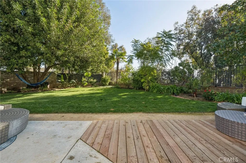 The often sought after Valencia Summit neighborhood is home to this single-story gem on the end of the cul-de-sac on Bellis Dr. Updated heavily over the last few years, this home has a beautiful, large backyard with custom landscape and deck. Multiple fruit trees, partial mountain views and quite private with no immediate rear neighbors. Inside, updated flooring, paint and kitchen appliances give a warm and tasteful welcome. This model is the largest San Marino at 1,640sf, and the wall dividing the kitchen and dining area has been removed to create an open concept that feels spacious. Updated light fixtures, including newer recessed lighting, and updated windows are a major plus. The office has a charming arched entryway and could be turned into a bedroom with an added door and closet. It looks out into the atrium that provides a lovely outdoor space for cozy quiet mornings or evenings. Both bathrooms have been updated, with a full remodel to the primary bath, and updated vanity, flooring, and paint to the guest bath. Sliders to the backyard from both the primary and guest rooms allow lots of natural light and easy access to the yard, or enclosed covered patio with respect to the primary room. The Tesla Solar system and Powerwall were installed in 2024. A LifeSource whole-home water filtration system provides premium filtered water out of every faucet inside the home, removing the need for plastic water bottles, or a water softening system. The roof was redone in December 2024 with titanium underlayment. Summit HOA includes multiple pools, hot tubs, tennis courts, and clubhouses, as well as pristine common area maintenance and private security. Come see this wonderfully updated single level home while it is still available.