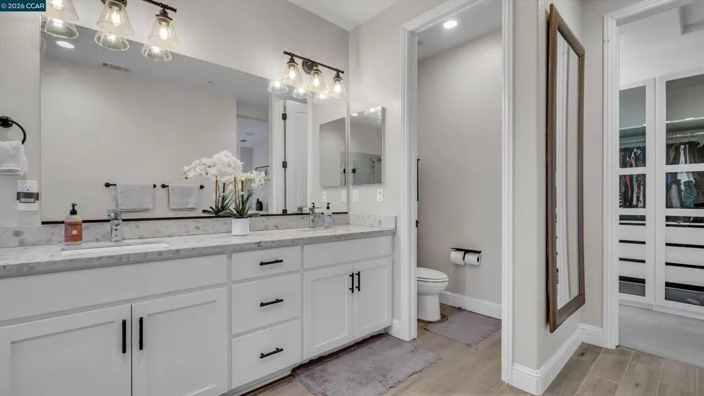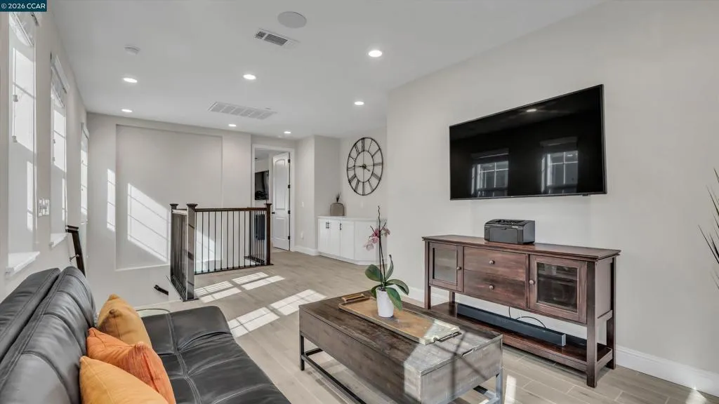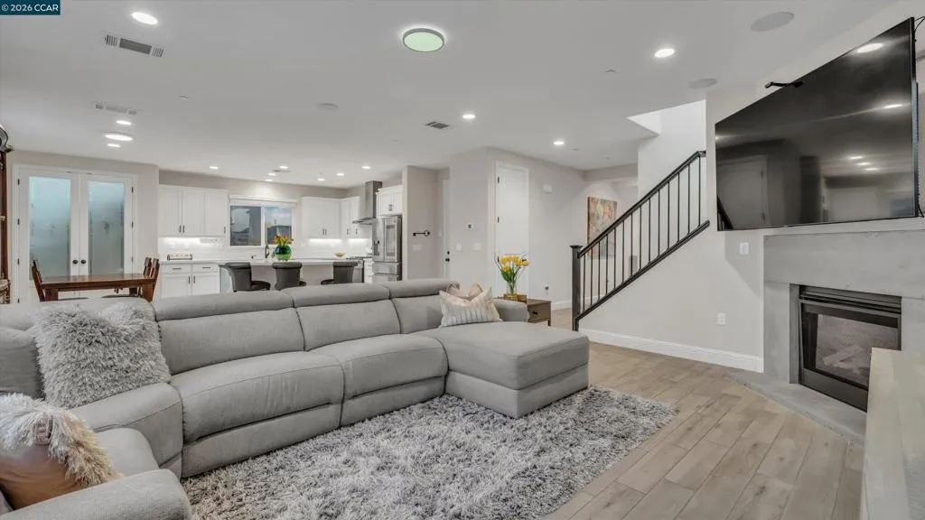 Welcome to a home where modern luxury, thoughtful design, and effortless California living come together in the sought-after Positano at San Marco community. Built in 2019, this stunning 5-bedroom, 3-bath home offers approximately 2,770 sq ft of beautifully designed living space with stylish upgrades throughout. The main level features a gourmet kitchen with quartz countertops, a large island, Samsung stainless steel appliances, shaker cabinetry, and a pantry with etched glass doors. The kitchen opens to a spacious family room with a cozy fireplace and elegant traverstone surround—wonderful for everyday living and entertaining. A bedroom and full bath on the first floor offer flexibility for guests. The low-maintenance backyard features a patio for gatherings, a cement succulent planter, and a gas stub for BBQs. Upstairs includes a versatile bonus room, convenient laundry room, and a luxurious primary retreat with a marble bath, dual vanities, and custom walk-in closet, plus three additional bedrooms and a full bath. A whole house fan helps keep the home cool and energy-efficient during warm summer evenings. Ideally located near parks, Hwy 4, BART, shopping, and dining.