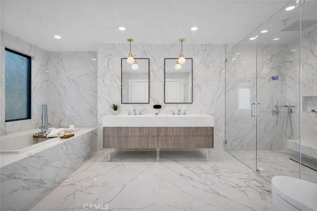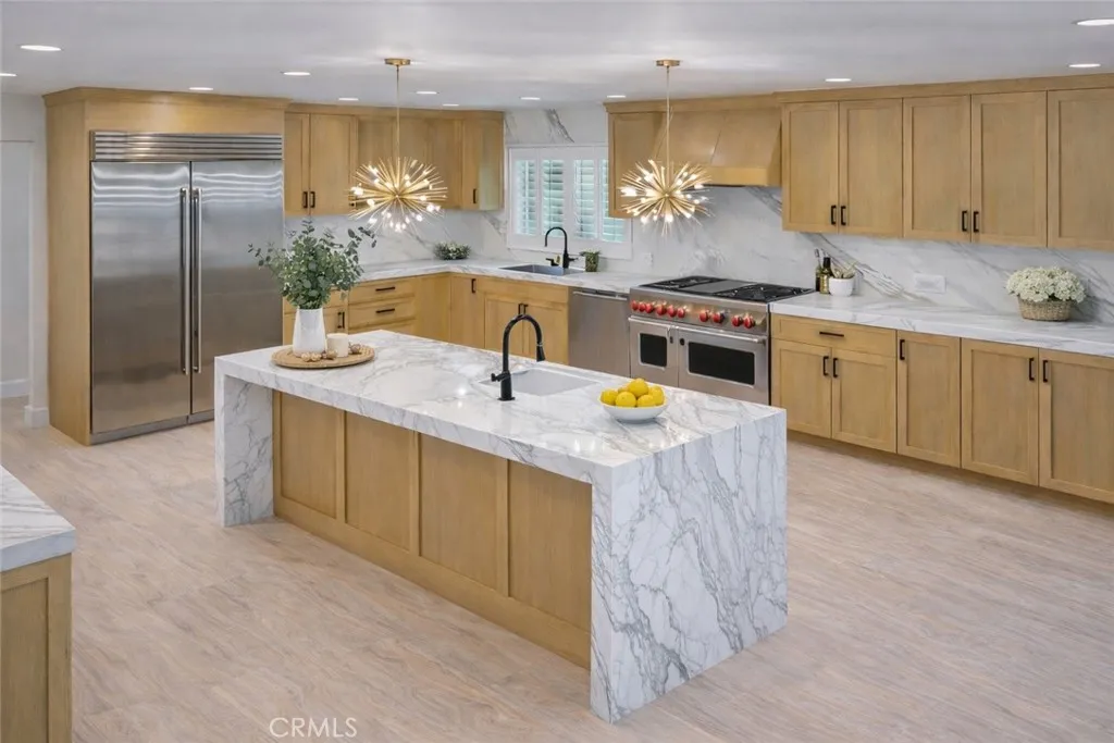 Chatsworth renovated home with open floor plan, solar, pool size spa, chef’s kitchen, luxury primary suite, and entertainer’s indoor-outdoor living. Welcome to 20500 Blairmoore St in Chatsworth, a beautifully renovated turn-key home offering modern design, high ceilings, and luxury finishes in one of the most desirable pockets of the San Fernando Valley. This extensively updated property delivers the move-in ready lifestyle buyers are searching for, combining modern upgrades, natural light, and spacious living areas ideal for both everyday living and entertaining. The thoughtfully designed layout features a highly desirable open concept floor plan with a dramatic living room, statement fireplace wall, spacious family room, and elegant dining area filled with natural light from large windows and tall ceilings. At the heart of the home is the chef’s kitchen, featuring custom wood cabinetry, high-end stainless steel appliances, professional gas range with signature red knobs, marble countertops and backsplash, and a large waterfall island with seating, making it the perfect gathering space for cooking, hosting, and everyday living. Spacious bedrooms provide comfort and flexibility, including a luxurious primary suite retreat designed as a private escape with a spa-inspired bathroom featuring dual vanities, premium stone finishes, soaking tub, and oversized walk-in shower. Large windows throughout the home enhance the warm contemporary design while bringing in abundant natural light, creating a bright and inviting atmosphere across all living spaces. Step outside and enjoy the Southern California indoor-outdoor lifestyle with inviting patio areas designed for relaxing, entertaining, and hosting gatherings. Additional highlights include designer lighting, custom cabinetry, recessed lighting, high ceilings, modern finishes, spacious garage, and generous driveway parking. Located in desirable Chatsworth, the home offers convenient access to parks, hiking trails, shopping, dining, and major commuter routes, making this property ideal for buyers seeking a fully renovated luxury home, open floor plan, chef’s kitchen, primary suite retreat, entertainer’s layout, and move-in ready condition in the San Fernando Valley.