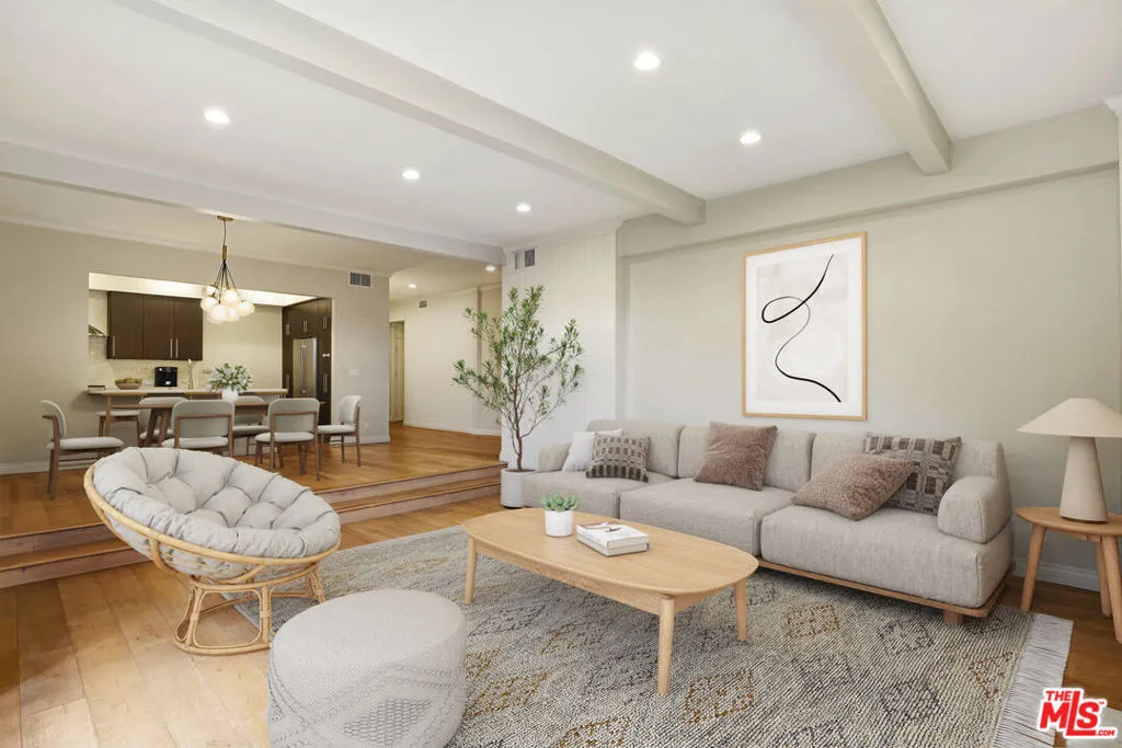 Absolutely beautiful, move in ready condo ideally located in the desirable WestwoodCentury City area. This spacious 1,800 square foot residence features two bedrooms and two bathrooms and has been thoughtfully renovated with modern finishes throughout. The open concept layout faces southwest, filling the home with natural light and refreshing breezes. Bright living spaces feature high wood beam ceilings, European white oak flooring, and recessed lighting that enhance the airy feel of the home. The updated kitchen flows seamlessly into the main living areas and includes stainless steel appliances, extensive custom cabinetry, quartz countertops, and a convenient wet bar perfect for entertaining. The step down living room centers around a cozy fireplace, creating a warm and inviting gathering space. The generous primary suite offers custom dual closets and a dedicated vanity area that leads to a beautifully updated bathroom with a large soaking tub and a spacious separate shower. The second bedroom is also generously sized and filled with natural light, featuring beautiful built ins ready to accommodate your design vision. Additional features include central air conditioning and heating, an in unit washer and dryer, and French style windows that open to a peaceful private balcony. The unit also includes two individual parking spaces, not tandem. Community amenities include secure gated parking, a heated swimming pool, sauna, and gym. Ideally located near shopping, dining, and entertainment, with convenient access to Century City, Beverly Hills, UCLA, and the Westfield Century City. Enjoy comfortable city living in one of Los Angeles' most sought after neighborhoods.