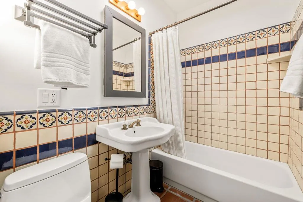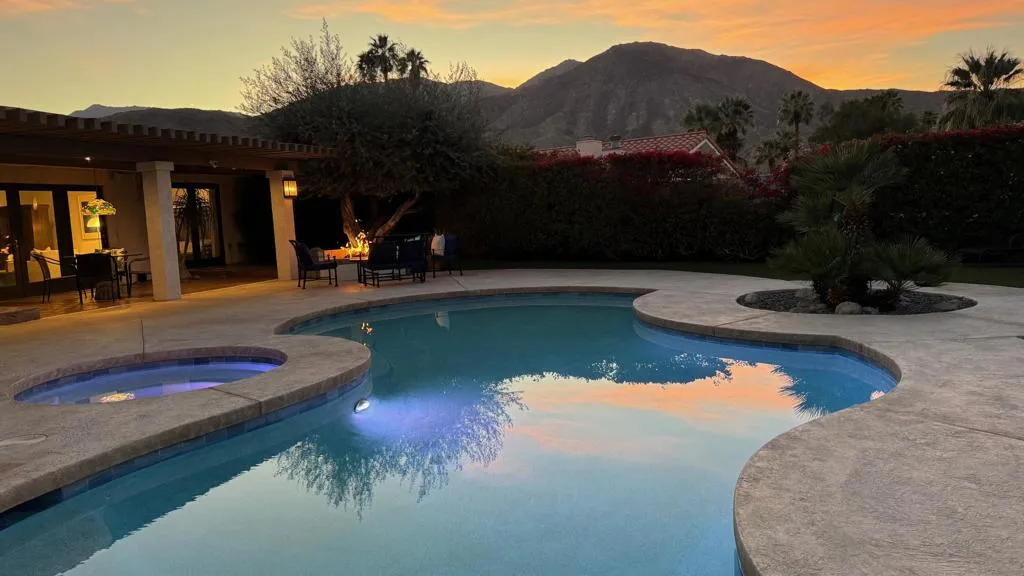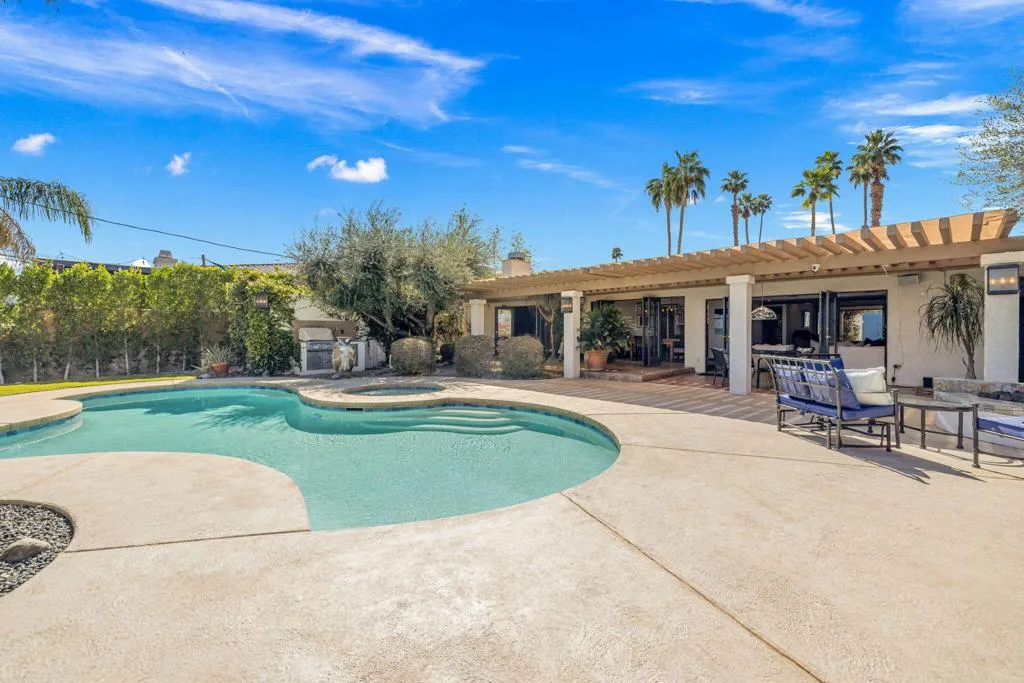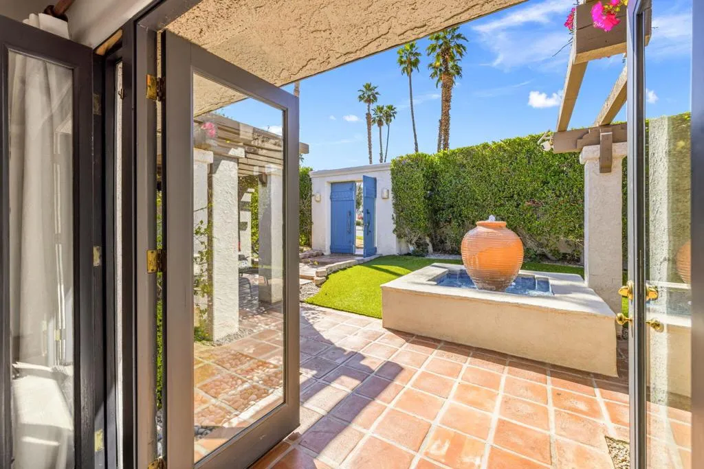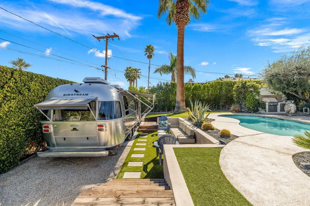 Discover this sensational, secluded/fully enclosed, Spanish-inspired desert oasis, with a poolside iconic Airstream, in highly sought-after South Palm Desert, just a short walk from the exclusive El Paseo shopping and dining district. Enter the full-size, double-door gates into the private front courtyard, complete with a bubbling fountain to enjoy while relaxing in lounging areas outside the primary and guest bedrooms. Proceed into the home through the spacious welcoming foyer, with views extending from the living room, through a continuous bank of glass doors running the length of the rear of the home, to the expansive back patio complete with al fresco dining, past the white, pebble-finished pool and spa and extensive deck. Then the surprise of a utility-connected silver Airstream at the far end of the property complements the mountain views beyond, with its coolness factor and versatility for hosting or use as a home office. This home has it all! Enjoy the continuous views of the inviting outdoor space (complete with low-maintenance artificial turf, fire pit and built-in BBQ) from the open living and dining rooms, and media room/den (complete with a fireplace and convenient full bathroom). The granite-lined open kitchen invites interaction with guests enjoying the views and festivities from the adjacent dining area. Classic clay pavers in the living and patio areas of the home, and tiles in two of the bathrooms, continue the contemporary Spanish theme. The primary bedroom boasts a fireplace and an updated dual-sink bathroom with private shower that welcomes the outdoors in. Both the primary and guest ensuite bedrooms have secluded sitting areas adjacent to the enclosed front courtyard, and side-panel door windows to enjoy fresh air while the doors are closed. The guest bedroom outdoor space even has a Chiminea fireplace for chilly nights. The third bedroom, with backyard views of the pool and Airstream, has dual bunk beds to welcome all the family. The expansive rear patio has multiple seating areas and outdoor dining. The freshly updated pool and spa complement the built-in grill and fire pit to welcome day and evening conversation and relaxation while soaking up the mountain views with hues that vary from sunrise to sunset. Then the surprise of the city-approved 2016 Flying Cloud Airstream, with its own recessed patio, provides additional fun, privacy and sleeping for 4. Hiking trails nearby. Come make this unique home yours