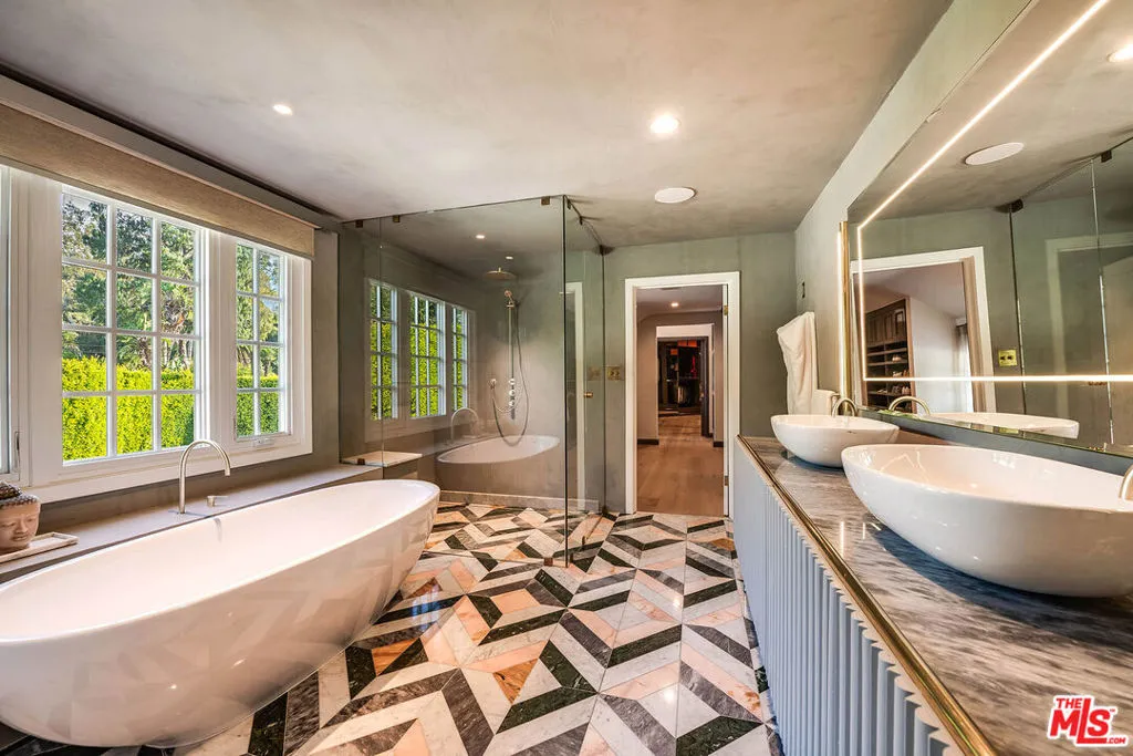 Situated within the prestigious guard-gated enclave of Hidden Valley Estates, surrounded by the homes of Hollywood's most notable residents, this stately East Coast-inspired traditional estate is a true jewel - thoughtfully reimagined to blend timeless architecture with refined modern comforts. Privately walled and gated, the residence offers exceptional seclusion and a pristine, elegant facade that sets a distinguished tone upon arrival. A gated driveway leads to a two-car garage, while a beautifully landscaped gated front courtyard creates a gracious and welcoming approach. The interiors reveal meticulous craftsmanship throughout, where imported stone, rich wood detailing, and contemporary lighting create a warm yet sophisticated atmosphere. A full-house Sonos sound system provides seamless audio throughout the residence, enhancing both everyday living and entertaining. The designer kitchen is a true culinary showpiece, appointed with burnished brass fixtures, striking forest-green marble, and a magnificent Officine Gullo cooking range as its centerpiece. The formal living room exudes character and refinement, featuring a dramatic stone fireplace, coffered wood ceilings, and custom steel-and-glass architectural accents. Expansive glass doors allow the family and dining rooms to flow seamlessly outdoors, creating effortless indoor-outdoor living. The grounds have recently undergone a complete redesign with newly refreshed landscaping, creating an immaculate outdoor setting. The backyard offers a sparkling pool and spa, generous lawn, al fresco dining areas, and a full outdoor kitchen complete with built-in barbecue, sink, and wine refrigerator, perfect for entertaining. One of the estate's most notable amenities is the recently renovated championship tennis court with lights, providing a beautifully upgraded setting for both daytime and evening play. Upstairs, the expansive primary suite serves as a tranquil retreat with a fireplace, lounge area, spa-inspired marble bath with soaking tub and shower, and an impressive dual closet and dressing room. Two additional bedrooms occupy the second level, while the third floor features a dedicated gym or additional bedroom suite. Additional amenities include intimate lounge and seating areas throughout and private access to the scenic hiking trails of nearby Franklin Canyon Park, offering a rare combination of privacy, elegance, and natural beauty in one of Los Angeles's most coveted communities.