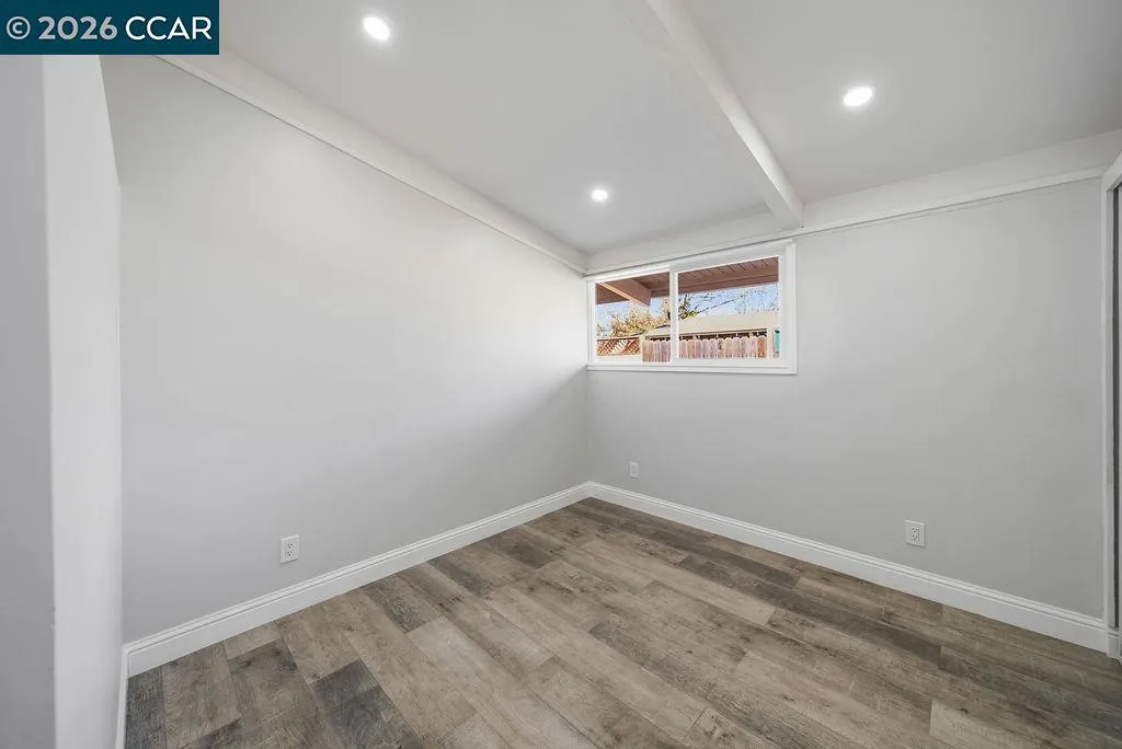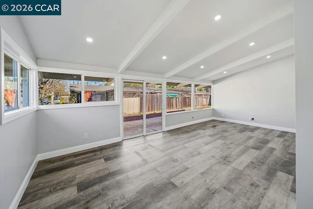 Beautifully updated single-story home on a corner lot! Walk into a bright and open layout. The updated kitchen features white shaker cabinetry, granite countertops, stainless steel appliances, and a gas range stove. Vaulted beam ceilings, recessed lighting, and expansive windows fill the home with natural light and create an airy, welcoming atmosphere throughout. The living space opens to the backyard through sliding glass doors, creating easy indoor-outdoor living ideal for relaxing or entertaining. Both bathrooms feature updated vanities, while the bedrooms provide comfortable and functional living spaces with the primary having direct access to the backyard. Updated engineered wood flooring and fresh interior paint complete the home’s bright, refreshed interior. Outside, the backyard offers a patio area ideal for relaxing while leaving room to add your own personal touches.The property also features a two-car garage and a spacious driveway. With thoughtful updates throughout and excellent natural light, this move-in ready home blends comfort, style, and functionality.