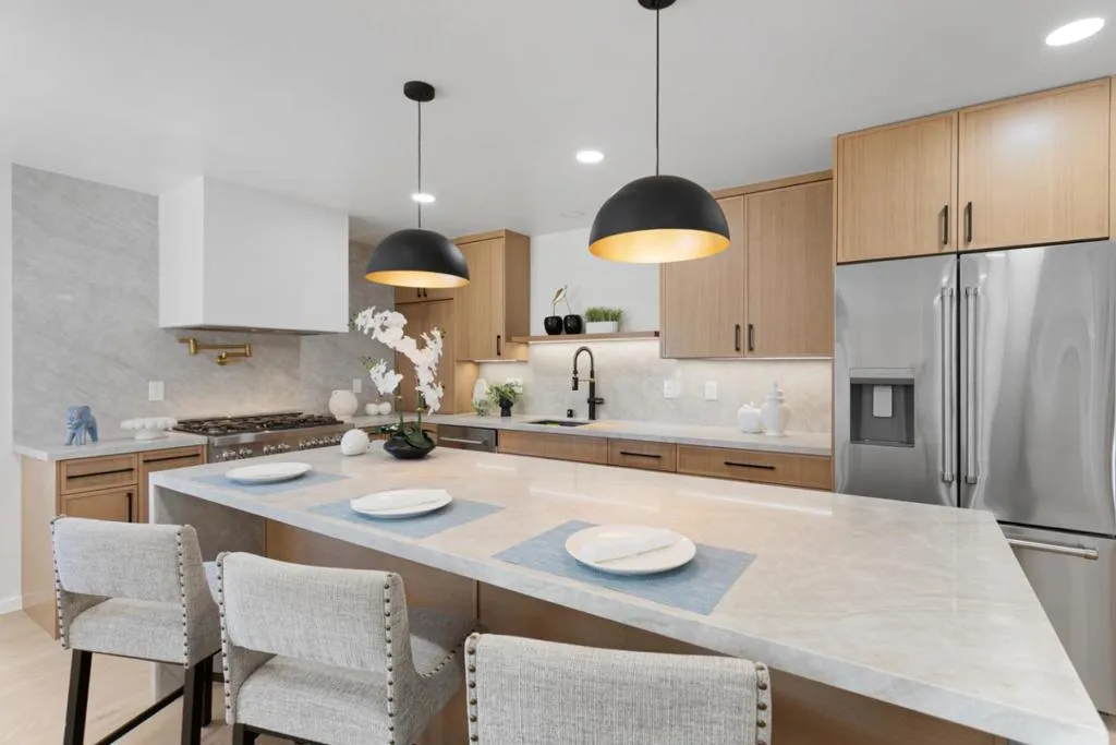 Fully renovated Campbell home featuring extensive upgrades inside and out. Highlights include new 9 wide plank flooring, fresh interior paint, recessed lighting throughout, and a beautifully remodeled kitchen with quartz countertops, waterfall island, custom cabinetry, and premium ZLINE appliances including a 36 dual fuel range. Major system improvements include brand-new plumbing (supply and drain lines), updated electrical with a 200A panel, new insulation, new drywall throughout the home and garage, new AC system, tankless water heater, and a new sewer line. The home also features a stylish living room fireplace with custom textured wall, updated bathrooms with Kohler / HansGrohe fixtures and designer lighting, new landscaping front and back, and a brand-new driveway. The upgraded garage offers epoxy flooring, built-in laundry, a 220V EV charger, and a custom pet wash station. Amazing location with easy access to major highways for convenient commuting.