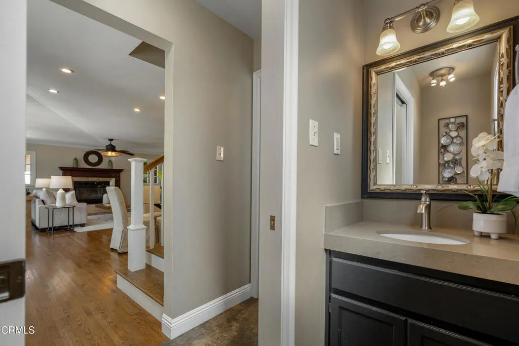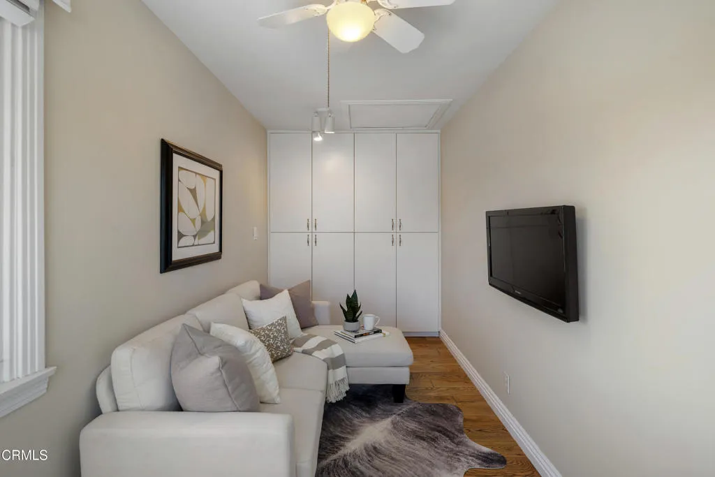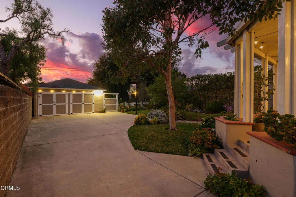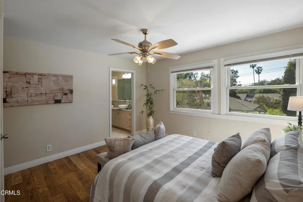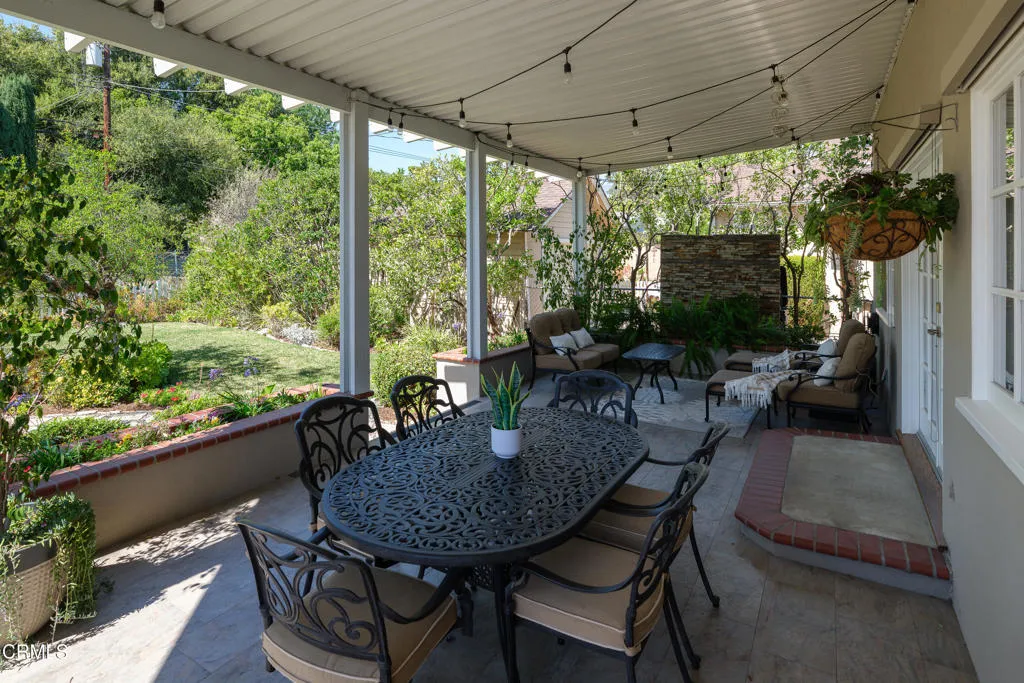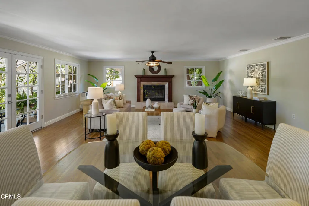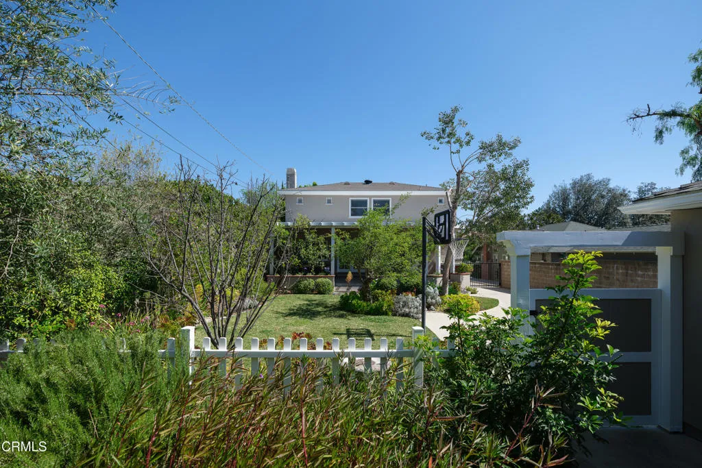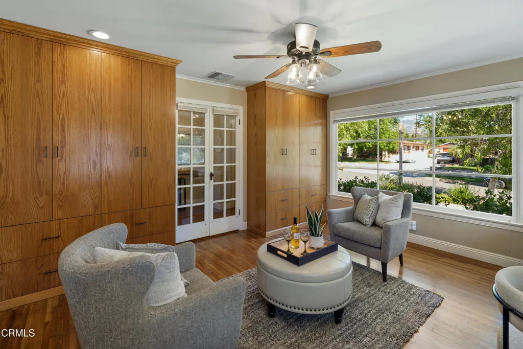 Set along a charming tree-lined street, this beautifully maintained home has been lovingly cared for & is on the market for the first time in over 40 years. Exceptional curb appeal, lush landscaping & a pathway leading to an inviting front porch welcome you. A formal entry with hardwood flooring introduces the home's warm & thoughtfully designed interior. A dedicated office offers an ideal work-from-home space with a large picture window overlooking the front yard, recessed lighting, crown molding & a built-in desk spanning the length of the wall. Custom-built floor-to-ceiling cabinetry flanks the French doors, adding both style & storage. To the right of the entry are 2 equally sized bedrooms, with hardwood floors, ceiling fans, dual-pane windows & generous closet space. These rooms share an updated full bathroom with tile flooring, a tub & shower combination, subway tile extending to the ceiling & a single-sink vanity. Beyond the entry, the home opens to a thoughtfully designed living, dining & kitchen area. The kitchen has tile flooring, stone countertops, recessed lighting, a chevron-pattern tile backsplash & a Thor 6-burner range & a walk-in pantry. The kitchen flows into a laundry room with washer & dryer hookups, a utility sink with cabinetry & a convenient guest bathroom. The adjoining living & dining spaces showcase crown molding, recessed lighting, a gas fireplace with a raised tiled hearth & an antique wood mantel. French doors open to a large covered patio, surrounded by raised planters & a built-in barbecue with tile counters & a prep sink, along with a peaceful water wall feature enhancing the setting. There's a grassy backyard with fruit trees, a garden area & a long driveway leading to the detached 2-car garage. The hardwood floors continue throughout the 2nd level. At the top of the stairs, a cozy den or TV room offers a flexible space with dual-pane windows & a lighted ceiling fan. Down the hall, 2 ensuite bedrooms. One features ample closet space & its own ensuite bath with tile flooring, a vessel sink vanity & a glass-enclosed shower. The spacious primary suite offers crown molding, 2 walk-in closets & a beautifully updated ensuite bathroom with a stone-topped vanity, recessed lighting & a glass-enclosed tiled shower with built-in shelving & tiled ceiling. With its thoughtful layout, inviting outdoor spaces, & timeless finishes throughout, this home offers comfort, style & functionality in a wonderful neighborhood setting.
