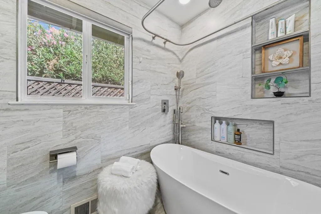 Stylishly renovated Sunnyvale single-family home combining classic architecture with modern design. Light-filled interiors feature oversized dual-pane windows, fresh interior paint (2023), hardwood flooring, custom shutters, and LED recessed lighting. Elegant living room highlighted by an Italian-tiled fireplace wall. The gourmet kitchen offers professional-grade stainless steel appliances, quartz countertops, custom cabinetry, designer backsplash, and a spacious pantry. Open kitchen, dining, and family room layout enhanced by an Italian porcelain tile media wall and motorized sliding door curtains, creating an ideal space for everyday living and entertaining. Spacious primary suite with dual closets, built-in workspace, and spa-like bath featuring radiant heated floors, Jacuzzi tub, and smart bidet toilet. Bright guest bedrooms and updated guest bath with full tile wall and tub/shower combo. Private backyard with covered gazebo and seating area perfect for outdoor enjoyment. Finished garage with storage, laundry area, sink, and new garage door. Conveniently located near parks, shopping, Caltrain, major tech campuses, and Homestead High School!