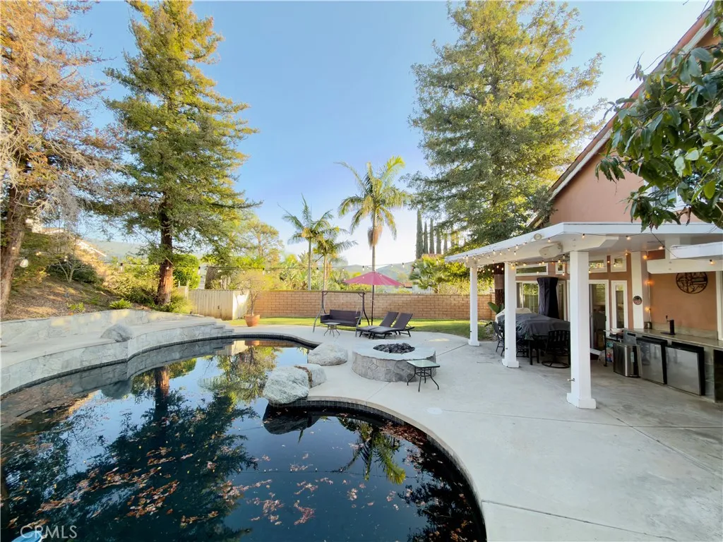 Welcome to this beautifully updated home featuring a freshly painted exterior, newer roof, newer windows and owned solar for energy efficiency. As you arrive, you're greeted by a large front yard and covered patio, perfect for relaxing. Inside, the home offers 4 spacious bedrooms, the first floor bedroom which is being used as an office can easily be made back to a bedroom and the first floor nearby remodeled bathroom offers a bidet and modern floating vanity. The primary suite is filled with natural light from numerous windows and features a stylishly updated contemporary bathroom and walk in closet. Step into the main living space with travertine flooring and soaring vaulted ceilings, creating an open and inviting atmosphere. The kitchen is designed for both everyday living and entertaining, featuring beautiful quartz countertops, a large island with cooktop, double ovens, and a spacious pantry closet. An entertaining bar with quartz countertop provides the perfect gathering space for family guests. The backyard is truly an entertainer’s dream. Enjoy a covered patio with surround sound speakers, multiple fruit trees, and a stunning waterfall into the saltwater pool and spa with a lagoon-style color. Additional highlights include a newer pool pump, large fire pit, and outdoor bar area, making it ideal for hosting gatherings year-round. Tall pine trees and beautiful backyard views complete this private outdoor retreat. Conveniently located close to schools, shopping, restaurants, and easy freeway access, this home offers the perfect blend of comfort, style, and convenience.