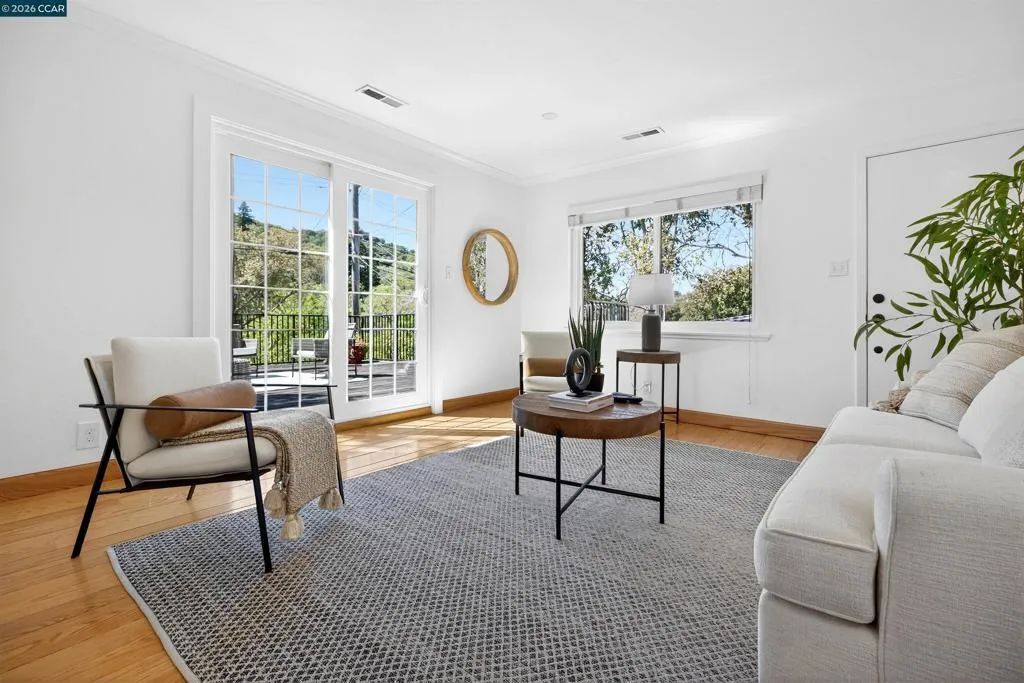Tucked away on a peaceful cul-de-sac, yet just minutes to town and BART, 27 Glorietta Ct embodies all the allure of early mid-century design combined with modern amenities. The open living and dining area has a wall of windows and glass French doors leading to the inviting patio and gardens. The kitchen is a chef’s delight, with stone countertops and stainless steel appliances including Thermador gas range.Enjoy family meals in the sunny breakfast nook with bay window. The main bedroom wing includes three generous bedrooms and beautifully updated hall bathroom with separate tub and shower. Fabulous primary suite offers wide picture windows with pastoral views and luxurious spa-like bathroom. Spacious family room opens to expansive sun-drenched deck. In the same wing, the versatile floor plan offers 4th bedroom and tastefully updated bathroom, as well as bright laundry room. Additional features include hardwood flooring throughout, dual pane windows, updated 2-car garage with epoxy floor coating and storage. The yard has room to roam and includes a delightful shaded patio and raised vegetable beds, ready for spring planting. 27 Glorietta Court is an unparalleled oasis of serenity, a home base from which to enjoy all that Orinda offers.