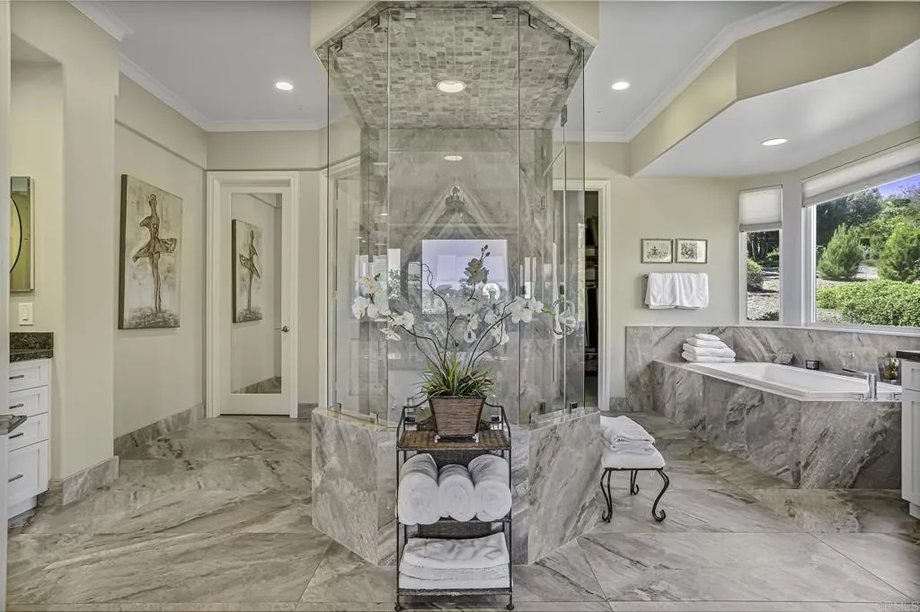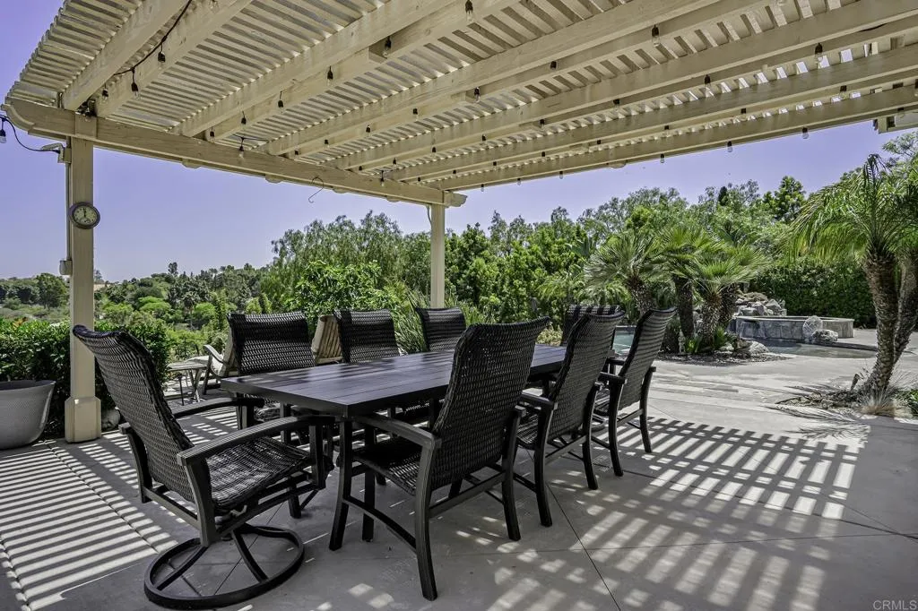 The Basics: 5 Bedrooms | 4 Full Baths | 2 Half Baths | 4,743 Sq Ft Resort-style Pebble Tec Pool & Spa with Waterfall | Pool House | Pickleball Sports Court | Panoramic Views | HOA $146 month. The Vibe: Light, bright, and soaring ceilings welcome you into a home that feels as good as it looks. This home is warm, welcoming, relaxed, and designed for connection — whether you're entertaining or just unwinding. The chef-style kitchen is recently updated and ready for anything, whether you're throwing dinner parties or heating up takeout. Peaceful nature views pour in from almost every room, setting the tone for everyday tranquility. Upstairs, a generous bonus living room makes the perfect teen hangout, media space, or private quarters for guests or a live-in companion. The existing Pool Table can be yours. Three on-suit bedrooms complete the upstairs. The Comforts: Lives like it's a single level — the primary suite and a secondary bedroom are both downstairs. Primary suite is large, comfortable and comes with its own fireplace to enjoy on those cold winter nights. Owned solar keeps your energy bills low, with dual-zone A/C and heating to stay comfy year-round. Waterboy whole-house filtration system, central vacuum system. Additional comfort features include a wine fridge and warming drawer. The Grounds: You’ve got 2 private acres to roam — and it’s all yours. Serve it up on the Pickleball(ish) Sports Court (complete with basketball hoop), then cool off in the vanishing-edge pool or soak in the spa. Rinse off in your very own pool house, then head to the garden house or plan out that future ADU — there’s room for it. Want multiple fruit trees and herbs? Well you’ll have to plant those, but there are roses and a pomegranate tree. Plenty of room to get inspired with your gardening. Horse-friendly and full of possibility. Your Surroundings: Set within a peaceful gated community of manicured homes, you’re surrounded by open space, trails for hiking, biking and/or riding. A strong and welcoming Olivenhain vibe. Award-winning Encinitas school district and just a few miles to a plethora of shops, restaurants and other things to buy.