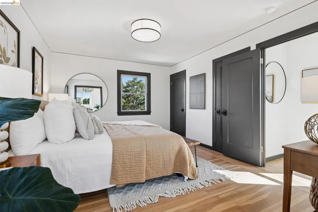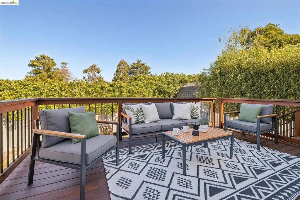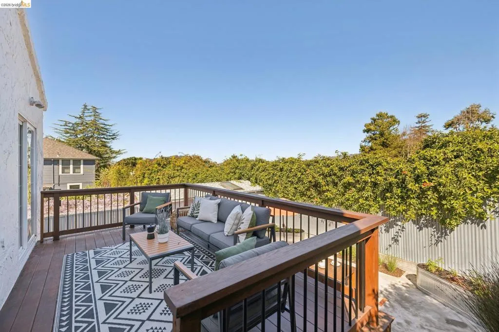 Just steps from beloved Terrace Park and three blocks to Solano Avenue, this 1930 Mediterranean bungalow in Albany Terrace has been lovingly held by one family for nearly three decades. Natural light fills every room, flowing over refinished hardwood floors that ground the home with warmth and character. Two bedrooms line the main level alongside a renovated bath with floor-to-ceiling tile and a Marc Newsom pedestal sink, that the sellers found it very hard to part with. At the center of it all, the thoughtfully updated kitchen gathers everyone around a generous island with cast concrete countertops, microcement backsplash, and new gas range. Sliding glass doors open to a deck overlooking a modern garden with smooth concrete terrace and lush plantings. The primary suite rises above it all—a treehouse-like retreat with views of the hills, Terrace Park, and peekaboo glimpses of the Bay and San Francisco. A quiet alcove serves as office, reading nook, or nursery, while the spa-inspired bath features a Hansgrohe multi-jet shower and floating sink. A private guest suite with separate entrance offers income potential or flexible living. Solar panels, tankless water heater, and 2-car tandem garage with workshop complete the picture. Near Marin Elementary and Albany's celebrated schools.