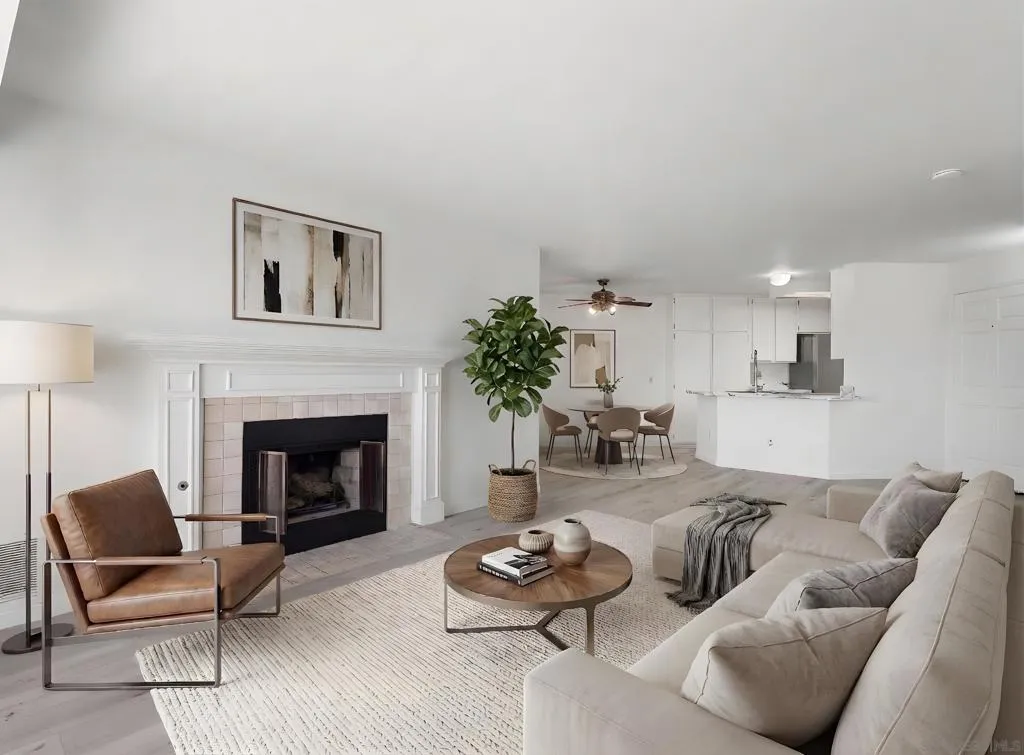 Panoramic hillside views overlooking Mission Valley highlight this beautifully upgraded ground-floor condo in the sought-after City Scene community. This spacious 3-bedroom, 2-bath home offers approximately 1,271 sq ft of comfortable living space in a prime central San Diego location. The open and inviting interior features luxury vinyl plank flooring, fresh interior paint, and a bright living area with a cozy fireplace. The upgraded kitchen showcases elegant marble countertops and ample space for cooking and entertaining. A standout feature is the seamless indoor-outdoor living. Sliding doors from the living room, primary bedroom, and second bedroom open directly to a private patio capturing eye-catching mountain and valley views above Mission Valley—perfect for morning coffee, relaxing evenings, and enjoying San Diego’s year-round coastal climate. The primary suite includes a remodeled bathroom with dual vanities and an updated shower enclosure, while additional bedrooms offer flexibility for guests, a home office, or extra living space. Additional highlights include three parking spaces, including a private tandem garage plus an additional permitted space. City Scene amenities include a pool, spa, fitness center, and BBQ areas. Ideally located near Fashion Valley Mall, Snapdragon Stadium, several naval bases, major freeways, beaches, universities, and downtown San Diego. The property is also available for rent at $3,700/monthly.