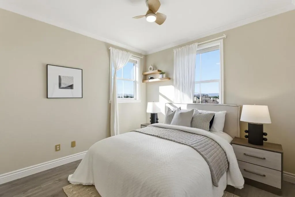 Welcome to this well-loved 2-bed, 2.5-bath townhome in the heart of North San Jose! A beautiful entry welcomes you with a natural stone accent wall and elegant marble flooring. The bright living room is filled with natural light and flows seamlessly into the kitchen and dining area. A large sliding door opens to a spacious patio with spring blooms and peaceful greenbelt views. Customized blinds and soft cotton curtains allow natural light to filter through while maintaining privacy, creating a relaxing Zen-inspired atmosphere complemented by light oak wall shelving. The gourmet kitchen features granite countertops with a full tile backsplash, a breakfast bar, and high-end appliances including a Samsung range oven and dishwasher, LG smart refrigerator, Samsung washer and dryer, and a powerful range hood, perfect for everyday cooking and entertaining. Two bedroom suites are located on the top floor, offering privacy and comfort for both owners and guests. The spacious primary suite includes two walk-in closets and an updated bathroom with double vanities and marble flooring. Prime location within walking distance to Costco, Ranch 99, parks, and golf courses. Close to restaurants, shopping, and easy access to Hwy 880 and 680, with convenient commuting via VTA and BART.