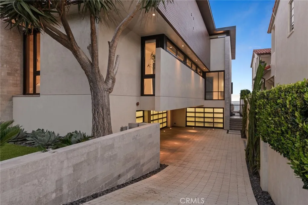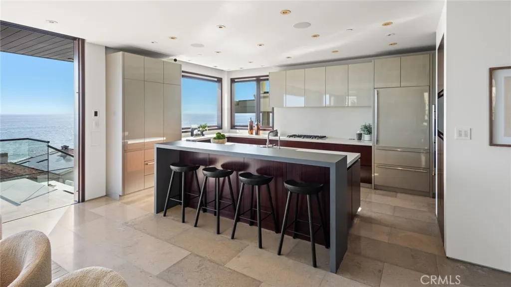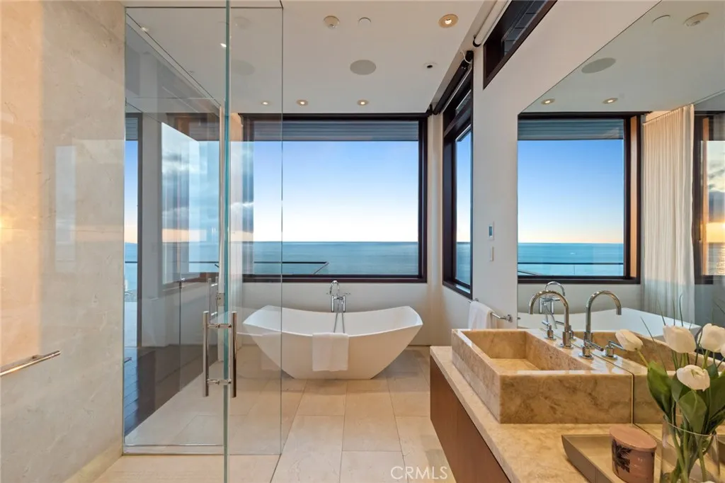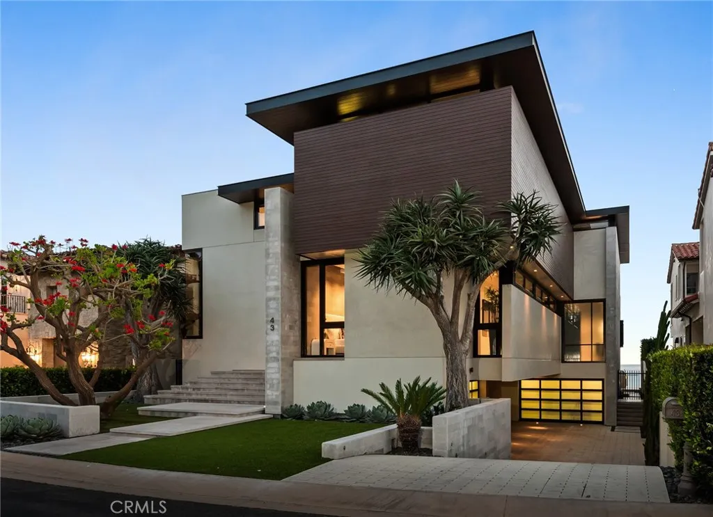 Behind the exclusive guard-gated enclave of The Strand at Headlands, this alluring contemporary residence epitomizes the pinnacle of luxury beachside living. Conceived by renowned architect, Horst Noppenberger, this property was custom built and tailored to enjoy the most awe-inspiring panoramic ocean and Catalina views. Spanning over 6,300 square feet of interior space, steel frames allow for fewer walls and large floor to ceiling windows, embracing an open-concept layout throughout. Upon entering, you are greeted by a dramatic entrance of stone walls and an alluring courtyard of ponds and fountains that overflow into the backyard pool and spa. With ample space across three levels, this home boasts 2 primary suites, 4 guest bedrooms, including an office equipped with a Murphy bed, and a secondary living room with its own private entrance. The gourmet kitchen offers minimalist features of sleek cabinetry, dual sinks, and butler's pantry of two Bosch dishwashers, 3 Sub Zero refrigerators, Wolf ovens, 2 wine refrigerators, and a generous size island for entertaining. Adjacent to the kitchen is the living room and dining room, which are complemented by the stone fireplace, neutral tones, and glass sliding doors that open up to the expansive deck overlooking the backyard, built-in BBQ, and several other seating areas to take in the mesmerizing sunsets. The exquisite primary suite showcases the most splendid views in the house, boasting a generous wrap-around deck complete with an outdoor fireplace. Moreover, it offers convenient amenities such as a mini bar featuring a sink and fridge, alongside a luxurious bathroom and a spacious walk-in closet. Fully equipped with an elevator, security system, subterranean parking, and state-of-the-art smart home technology (featuring Lutron, Sonos, and Nest systems), this estate offers every modern convenience imaginable. Further enhancing its appeal are accommodations for up to four cars in the garage plus a separate garage with two golf carts; outdoor fire pits and ceiling heaters; a community clubhouse offering a pool, spa, gym, recreation room; and direct access to The Strand Beach.