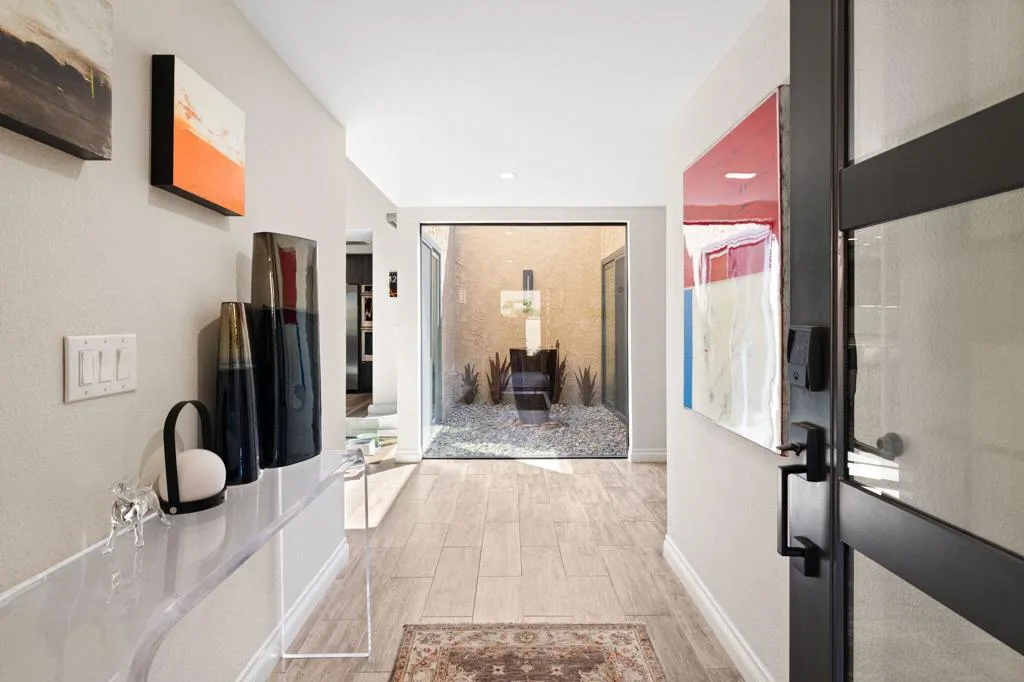 Beautifully remodeled and expanded to include 3-bedrooms and 2-baths. Located on elevated site of a private cul-de-sac street. Tile flooring throughout. Glass windows and sliders were replaced in 2024. The Upgraded and redesigned kitchen is open to dining room / living room area with fireplace. Silestone counters, custom cabinetry GE Profile refrigerator, SubZero wine fridge, GE Monogram double ovens, and 6-burner gas stovetop. Bedrooms and baths are also updated. with Tile showers. Main bedroom has custom shade structure installed on the private patio. LED lighting, smart switches and kitchen under cabinet lighting, Double attached garage with laundry, storage cabinets ad epoxy floor. Gas BBQ on patio area. The yard area has been extended and professionally landscaped to enhance the outdoor experience. 20-owned Solar Panels and new main electrical panel. This home is move-in ready in a private view setting located near 2-HOA pools/spas. Ironwood memberships are available for golf, tennis, fitness & dining.