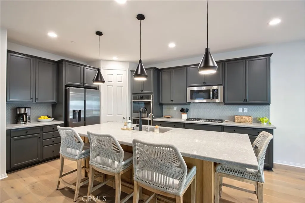 Welcome to the beautiful Sommers Bend community in the heart of Temecula. This spacious 4-bedrooms home, with a den that can easily serve as a 5th bedroom, offers the perfect combination of comfort, style, and everyday functionality. Even better, the home comes with paid-off solar panels, helping you enjoy energy efficiency from day one. As you enter the home, you’ll immediately notice the warm and welcoming feel created by the gorgeous white oak wood flooring throughout the downstairs and the abundance of natural light that fills the space. The thoughtfully designed floor plan includes a convenient downstairs bedroom and full bathroom, perfect for guests or multi-generational living. The den provides flexible space that can be used as a home office, playroom, or additional bedroom depending on your needs. The heart of the home is the open and inviting kitchen, featuring stainless steel appliances, a double oven, walk-in pantry, quartz countertops, and a large center island that doubles as a breakfast bar. It’s a wonderful space for cooking, gathering, and entertaining family and friends. Upstairs, you’ll find three additional bedrooms, including the spacious primary suite with a walk-in closet and a relaxing en suite bathroom with dual sinks, a soaking tub, and a separate shower. One of the secondary bedrooms even includes its own walk-in closet. The upstairs also offers a large laundry room with sink and cabinetry, adding convenience to your daily routine. Step outside to your private backyard retreat, where you can relax under the covered patio or host gatherings around the BBQ island and fire pit while enjoying the peaceful sound of the fountain. The backyard also features low-maintenance artificial grass and a side yard ready for your garden plus self watering feature with low maintenance for your plants. The 3-car tandem garage provides plenty of room for parking, storage, or even a workshop or hobby area. Living in Sommers Bend means enjoying wonderful community amenities, including a clubhouse, resort-style pool, event spaces, a 21-acre sports park, fitness center, and scenic walking trails, all within a friendly and welcoming neighborhood. This exceptional home truly offers the best of Temecula living. Come see it for yourself and imagine making it your forever home.