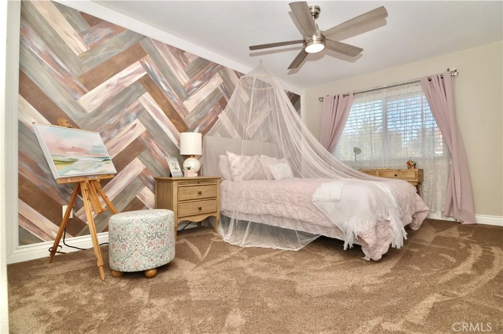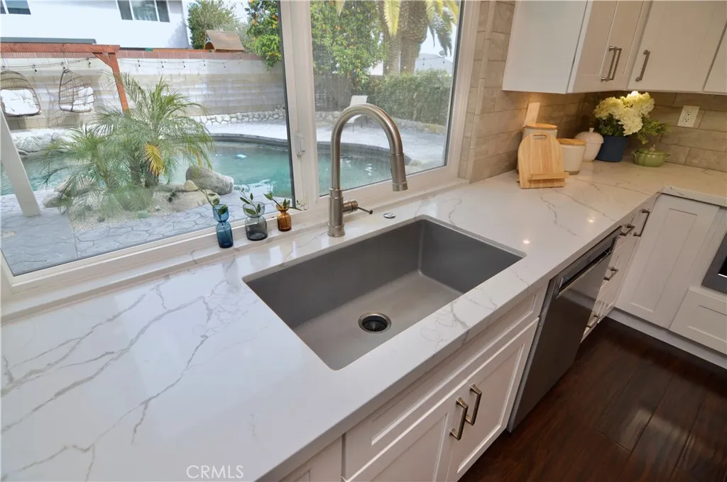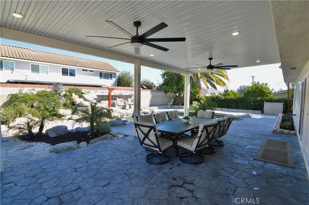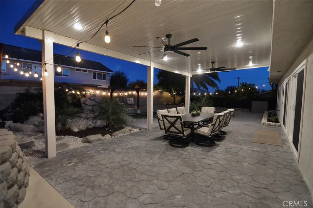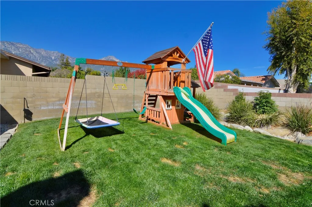 Welcome to this beautifully remodeled 4-bedroom, 3-bath home in the highly desirable Alta Loma area—where elegant design meets resort-style outdoor living. From the moment you arrive, the professionally landscaped yard and charming flagstone porch set the tone for the exceptional living experience inside. Vaulted ceilings and dramatic south-facing architectural windows flood the home with natural light while maintaining privacy. The formal living and dining areas feature plantation shutters and flow into the expanded chef's kitchen, thoughtfully designed with abundant workspace, added storage, a professional 36" Monogram range, built-in Monogram microwave, Zephyr vent hood, recessed lighting, and a stylish island pendant. The inviting family room centers around a ledgestone fireplace and opens through two large sliding doors to a stunning backyard retreat. Enjoy a rock waterfall, solar-heated Pebble Tec pool, and an expansive covered patio with recessed lighting and dual ceiling fans—perfect for year-round entertaining. A raised play area with play structure adds additional outdoor fun. Upstairs, the spacious primary suite offers an updated bathroom with a walk-in shower and walk-in closet. Three additional bedrooms feature mirrored closet doors, ceiling fans, and newer windows. The second floor also includes a laundry room and an updated bathroom with a stylish barn door. Additional highlights include a finished 3-car garage with overhead storage access, large gated RV parking, a spacious storage shed, room for multiple recreational vehicles, and a newer roof. Conveniently located near the 210 freeway, shopping, dining, and everyday amenities.