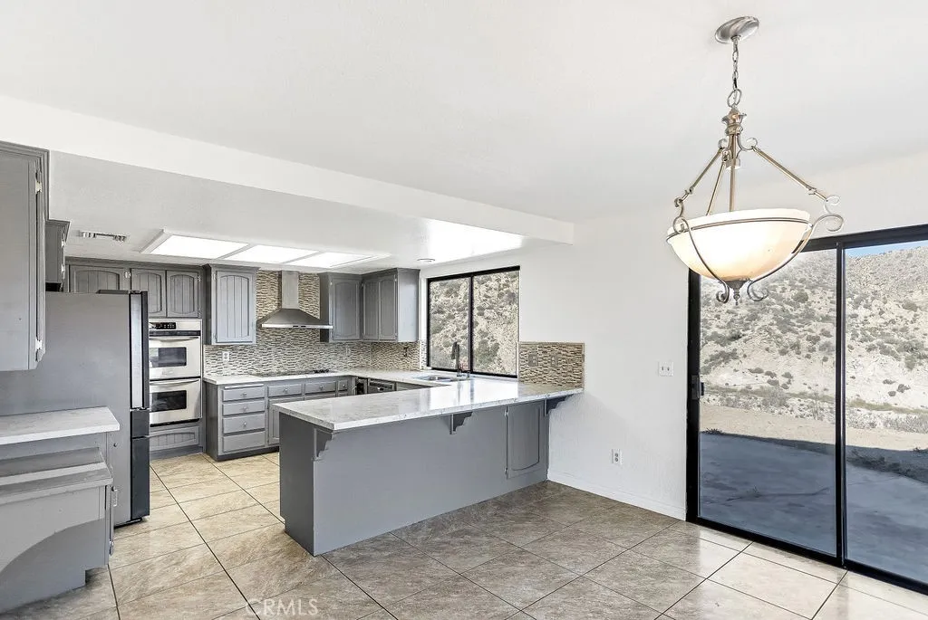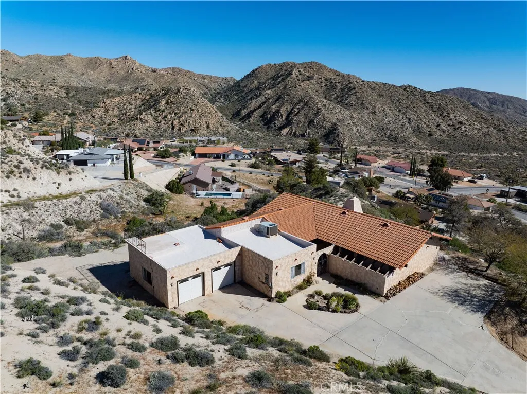 ** Honey Stop The Car! ** The Mount Ridge Estate Is Finally Available! This stunning three-bedroom, two-bathroom Santa Fe home boasts over 2,335 square feet of living space, nestled atop your own private mountain and surrounded by 2.7 acres of prime high desert real estate! The drive to this unique property sets the mood. As you travel through one of the most sought-after neighborhoods, you’ll see well-cared-for homes adorned with lush desert flora and majestic mountains in the backdrop. As you pull up the private driveway, you’re greeted by beautiful boulders, thoughtful landscaping, and a character-driven Santa Fe Adobe aesthetic. Walking through the double-gated courtyard, you’ll realize this is no ordinary home. Inside, you’ll be impressed by the modern open floor plan! Tile flooring, open wood beam high ceilings, and abundant natural light flow through oversized floor-to-ceiling windows, creating an airy feeling throughout. A beautifully designed dual fireplace featuring elegant tile and mid-century rock façades splits the den and large living room. Designed for entertaining, the remodeled kitchen opens to the dining and living areas. It boasts quartz countertops, a mosaic backsplash, stainless steel appliances, a double sink, and plenty of cabinets—perfect for culinary delights! You’ll also find a spacious dining room with a luxurious wet bar outfitted with display cabinets and wraparound tile countertops. Each guest bedroom feels like a primary room and includes ample closet space, built-in desks, ceiling fans, and windows with a view! The guest bathroom features a stylish walk-in tiled shower, dual vanity, and a large mirror. The primary suite is spacious, with high open beam ceilings, a large walk-in closet, and floor-to-ceiling windows showcasing amazing views. The primary bathroom features a dual vanity, a uniquely tiled walk-in shower, and a stunning “Roman” soaking tub! Outside, enjoy incredible panoramic views that rival those of Joshua Tree National Park from the Adobe-textured concrete patio! A private staircase leads to a lookout platform, making you feel on top of the world! Additional features include a large double-door garage, an indoor laundry room, tile roofing, efficient mini-split systems for heating and cooling, ceiling fans, and more! Don’t miss this rare opportunity—call today for your private showing before it’s gone!