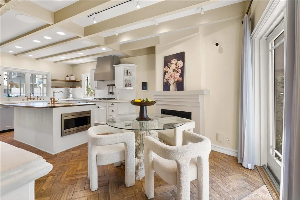 Experience refined coastal living in this exquisite French Provincial tri-level home, ideally positioned in exclusive Naples Island of Long Beach. Just steps from the scenic waterways and moments from world-class dining, this beautifully appointed residence offers timeless elegance with flexible furnishing options to suit your lifestyle. The first level welcomes you with a grand entry that opens to a formal living room featuring soaring vaulted ceilings, a fireplace, and a wet bar, perfect for entertaining your guests. The formal dining room showcases a stunning coffered ceiling with decorative floral inlays, and a stunning chandelier adding a touch of sophistication. A spacious eat-in kitchen anchors the rear of the home, complete with a large center island and prep sink, full suite of appliances, and direct access to a private patio with built-in BBQ, ideal for alfresco dining. A guest powder room, indoor laundry, and direct-access two-car garage complete this level. The second level offers three bedrooms and a large family/media room with its own wet bar and wine refrigerator. One of the bedrooms features an en suite bath, while another versatile space toward the rear adapts beautifully as a private bedroom, executive home office, or personal fitness studio, perfect for today's flexible lifestyle. A second full bath serves the remaining rooms. Ascending to the third level, you'll find the primary suite, a serene retreat featuring a fireplace, walk-in closet, and a newly remodeled spa-inspired bath with floor-to-ceiling tile, a floating vanity, modern fixtures, and an expansive dual-head walk-in shower. The entire suite is designed for privacy and comfort, separated from the rest of the home. A few steps above the primary suite leads to the rooftop deck, an entertainer's dream with panoramic 360º views of Naples Island, comfortable patio seating, and a gas fire pit that is perfect for sunset gatherings or evening relaxation. This exceptional home combines timeless European charm with modern amenities, all within Naples Island's coveted waterfront enclave, one of Southern California's most distinguished residential communities.