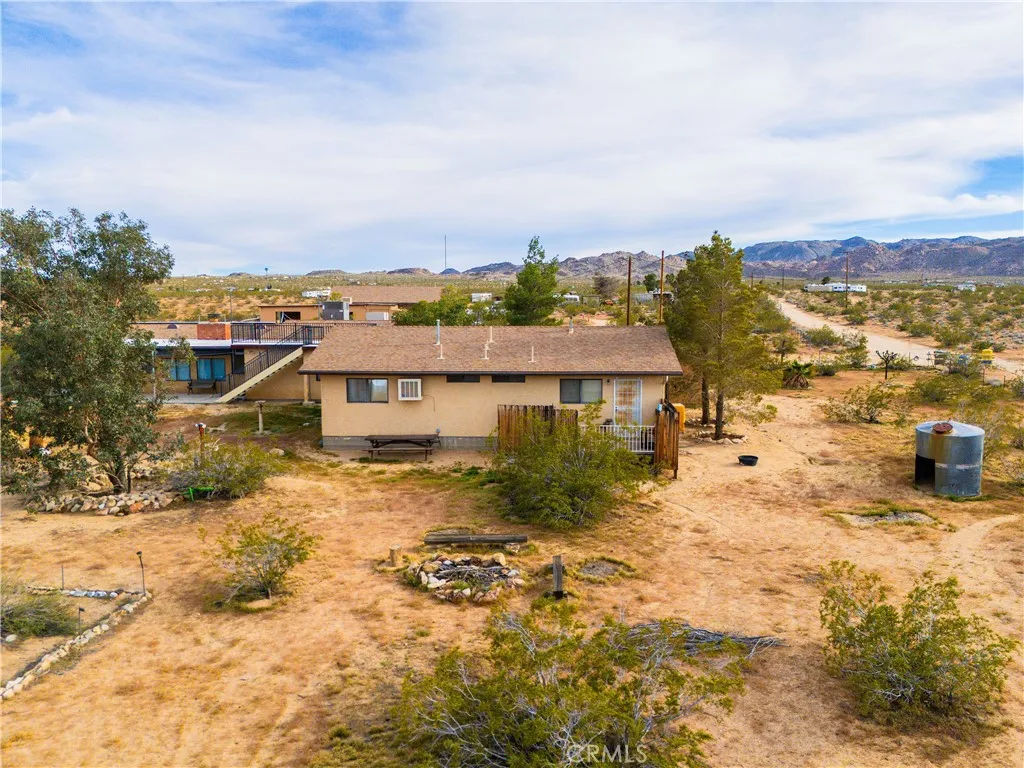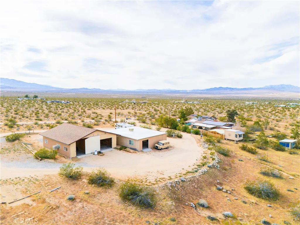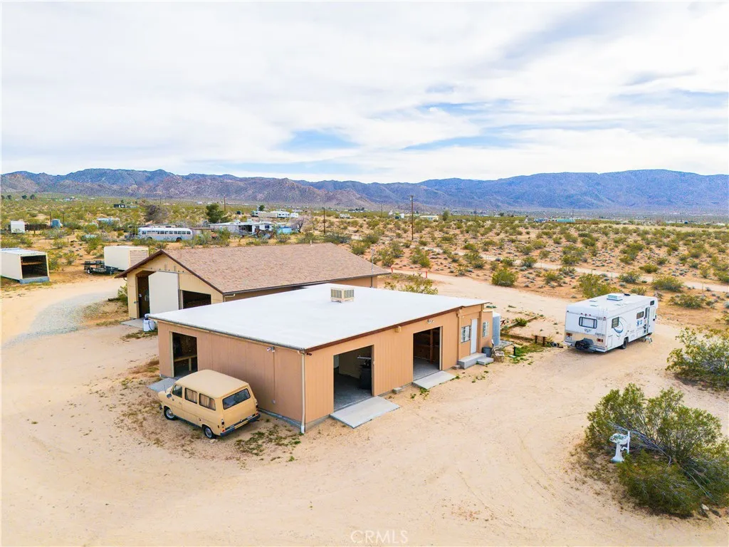 Welcome to Johnson Valley where wide open desert landscapes meet incredible opportunity! This unique property features two homes on one lot plus an impressive 3,500+ sq ft workshop/garage. Ideal for multi-generational living, an income property, or the ultimate desert retreat. There is an additional 2.5 acre lot included totaling 7.548 acres. Main home just under 2,000 sqft has been thoughtfully renovated down to the plumbing and electrical, offering peace of mind and comfort. The spacious kitchen is the heart of the home featuring granite countertops, ample cabinetry, newer Samsung appliances, walk-in pantry, and dedicated laundry room. Versatile bonus room provides endless possibilities perfect for a home office, dining room, creative studio, or additional lounge space. Bedroom offers generous closet space and storage, including a walk-in area with sliding doors leading to the back porch, creating a seamless indoor-outdoor flow. One of the home’s standout features is the rooftop deck with safety railing, where you can take in stunning 360 degree desert views and enjoy stargazing under desert skies. Also an enclosed patio area with jacuzzi. Guest home offers about 960 sq ft this includes a attached garage that is insulated to the same standard as the home and could easily be converted into additional living space. Both homes are equipped with solar panels and on-demand water heaters, while the main home also includes a traditional standing water heater for added convenience. What truly sets this property apart is the massive 3,500+ sq ft garage and workshop built by owner, a general contractor with permits. The structure features six auto bays, including two tandem RV bays with full RV hookups, making it ideal for off-road enthusiasts. Offering plenty of room to store, maintain, and customize desert toys and adventure vehicles. Workshop also includes a full bathroom, laundry hookups, & hot water heater providing even more flexibility for use. Workshop has built in air compressor and overhead hoist, every detail designed for functionality and efficiency. With approximately 2,000 sqft of shop that could easily convert into living space, this area offers incredible potential for a studio or living space if desired. Adding even more value each structure has its own septic system, electric meter & field fencing. With endless possibilities, expansive desert views, and an incredible amount of usable space, this one of a kind property is a rare opportunity!