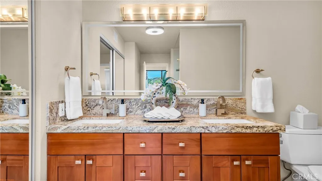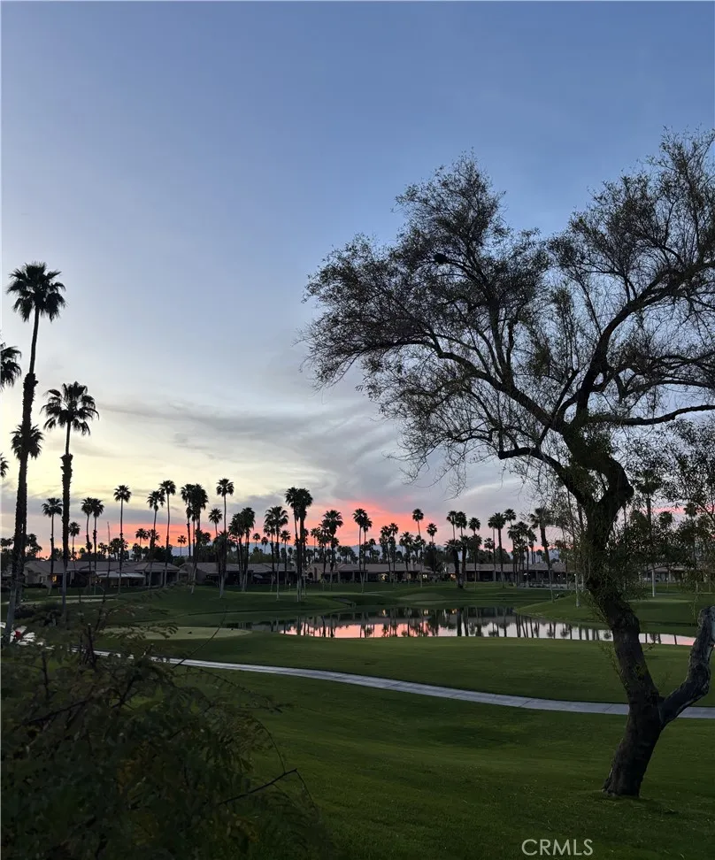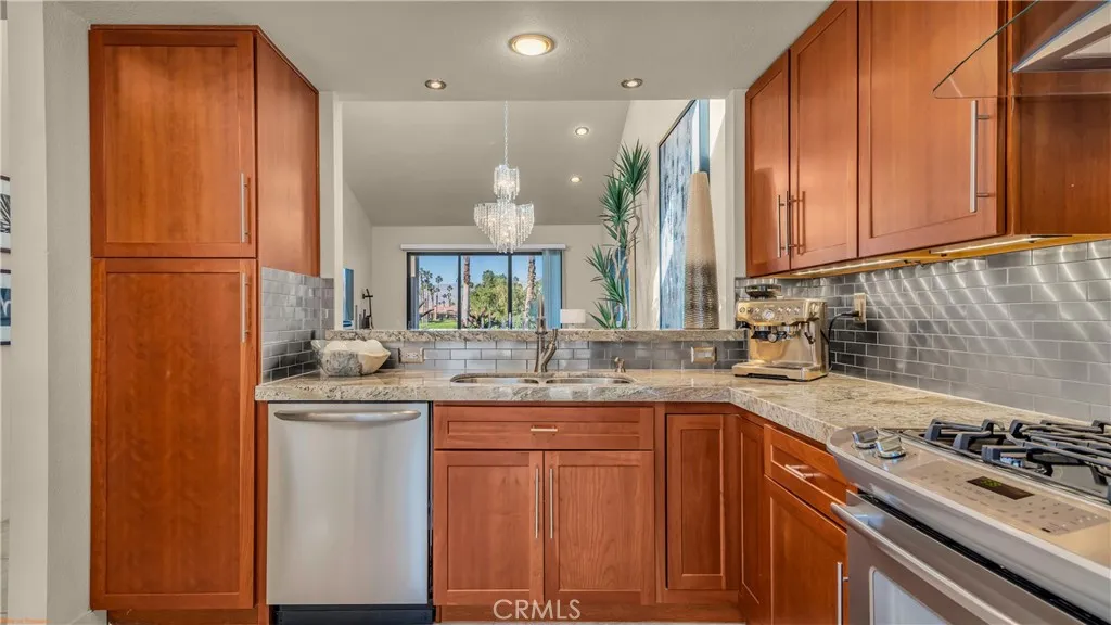 Turnkey Furnished, and as they say, Location, Location, Location, this Condo has it all. Elevated view over expansive double fairways featuring Ted Robinson's famous Signature "Island Green" 11th HOLE and fairway on the Championship Course. Beautiful, large blue Water lakes surrounded by lush green fairways. All backed by gorgeous, ever-changing textures of our little San Bernardino Mountains. Enjoy desert patio living at its finest. You will enter through one of the absolute largest private courtyard patios in all of Palm Valley C.C. Built-in seating and one of the finest BBQs Money can buy, a DCS! (This courtyard would be the perfect space for a private Jacuzzi) Now step inside this condominium masterpiece. The Jacaranda model is the epitome of efficiency. Absolutely no wasted space. No dark hallways, wasted rooms, it's all very functional. This is where you see true Quality. The kitchen features a professional-style gas range, Frigidaire stainless steel appliances, Custom Cherry Wood Cabinets and, and River Bordeaux granite countertops, with a stainless steel backsplash. Featuring 2 master suites and 2 full baths, the bathrooms include custom tile and cabinetry, and more River Bordeaux granite countertops, custom lighting, and mirrors. This home features LED lighting throughout and a showpiece crystal chandelier in the dining room. Enclosed washer/dryer. Designer furnished. No stone has been left unturned in the Top Shelf Remodel. Not a Home Depot flipper remodel; everything here is designer-craftsman level. AIR CONDITIONED GARAGE. SECURITY CAMERAS from the front to the back and in the garage. Call For easy showings!