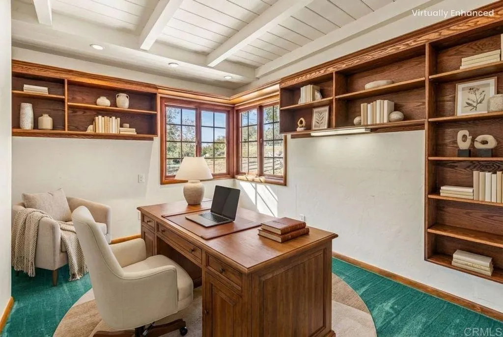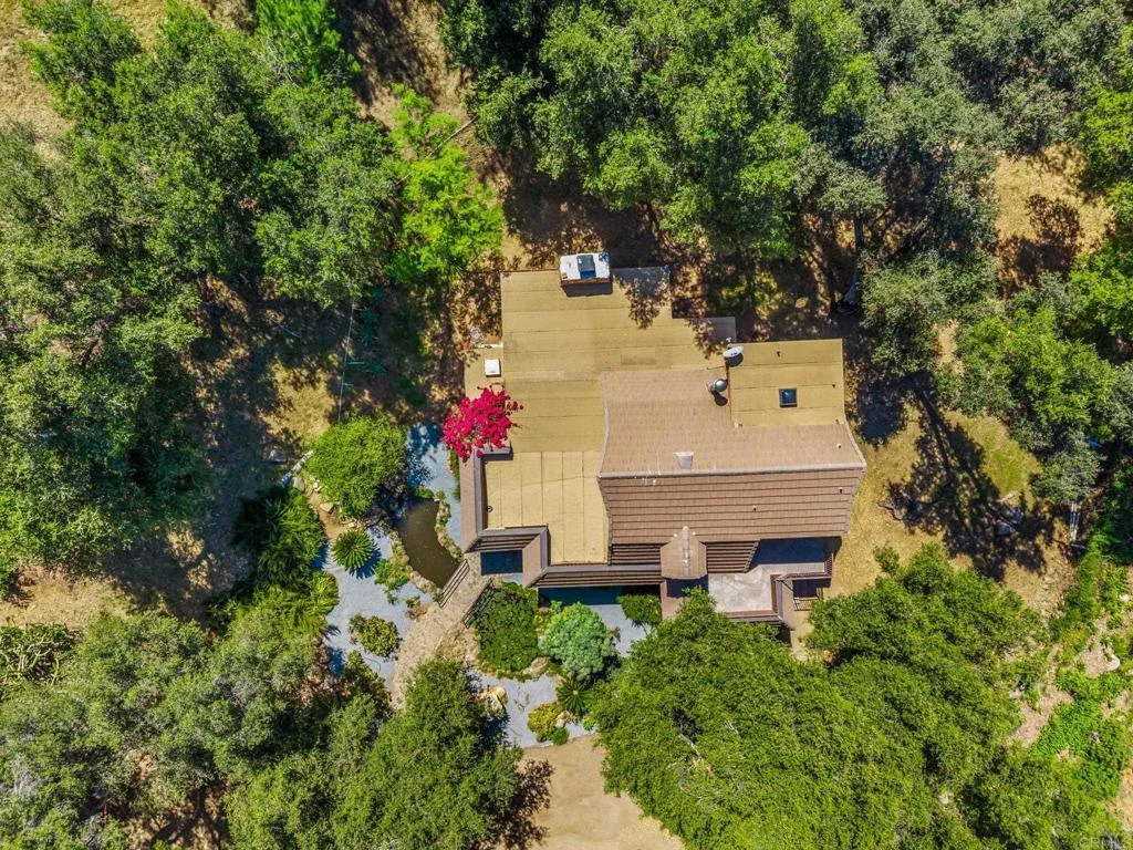 Located in Lawson Valley just 15 minutes from the conveniences of Rancho San Diego, this lodge-style retreat sits on two parcels totaling 14.13 acres, offering exceptional privacy, natural beauty, and wide-open space. A tranquil koi pond with a waterfall and charming stone bridge creates a memorable arrival at the front entrance. The home showcases timeless rustic character with natural stone accents, exposed wood beams, and expansive windows that fill the interior with natural light while framing peaceful views of the surrounding landscape. Inside, the spacious living room features pitched vaulted ceilings and a striking stone fireplace with a hand-carved wood mantle, creating a warm and inviting gathering space. The kitchen opens to the dining area and includes a large walk-in pantry for generous storage. Saltillo tile floors run throughout the main living areas, adding warmth and timeless character to the home’s design. The main level offers two bedrooms, including one with a half bath, along with a full guest bathroom featuring an accessible shower. A laundry room is conveniently located on the first floor, and French doors lead to the backyard, blending indoor and outdoor living. Upstairs, the expansive primary suite serves as a private retreat with wood beam accents, a cozy wood-burning stove, an upgraded bathroom, and an enormous walk-in closet. Step outside onto the oversized balcony to take in peaceful views and fresh air. Additional features include owned solar for energy efficiency and a detached dome garage/workshop with an office, providing flexible space for projects, equipment storage, creative work, or a private workspace. The property’s grounds create a truly tranquil setting, complemented by a mature succulent garden and mature oak trees that provide shade and natural beauty throughout the property. With animal enclosures already in place, ample open space, and a national park-like environment, this property offers exceptional privacy and room to create your dream rural lifestyle.