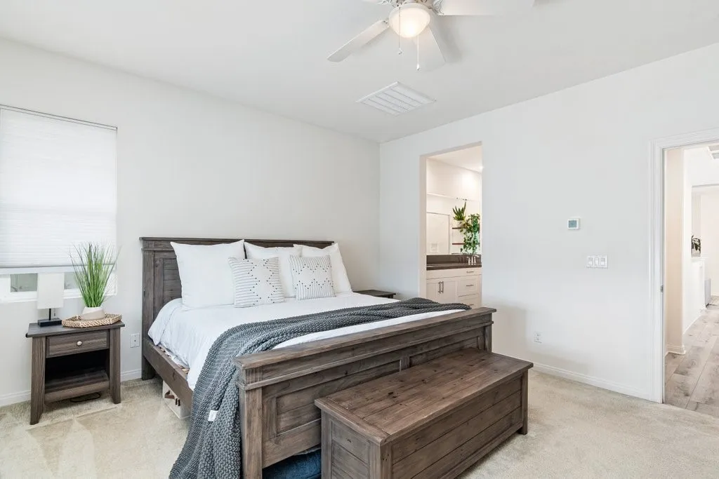Beautiful 4-bedroom, 3-full-bath home in the highly desirable Park Place community. This well-designed home features luxury vinyl plank flooring, 9-foot ceilings, and multiple living spaces. Downstairs you’ll find a formal dining area and spacious family room. The modern kitchen includes stainless steel appliances and a kitchen island with bar seating, perfect for everyday living and entertaining. A convenient downstairs guest bedroom and full bathroom are ideal for visitors. Upstairs you’ll find the primary suite with a walk-in closet, dual sinks, and a separate tub and shower, along with two additional bedrooms, a full bathroom, a spacious loft, and a laundry room (washer and dryer included). Enjoy outdoor living under the Alumawood patio cover, with no direct rear neighbors providing added privacy. The HOA maintains front landscaping and offers access to a clubhouse, pool, fitness center, tennis and basketball courts, dog park, and more. Conveniently located near parks, schools, shopping, and restaurants.