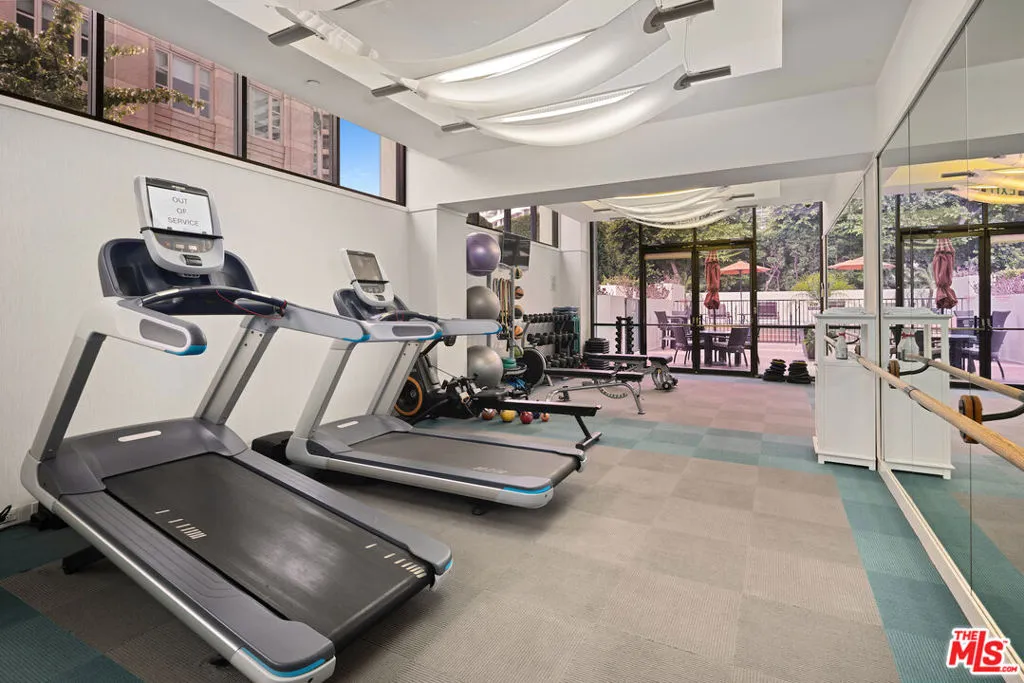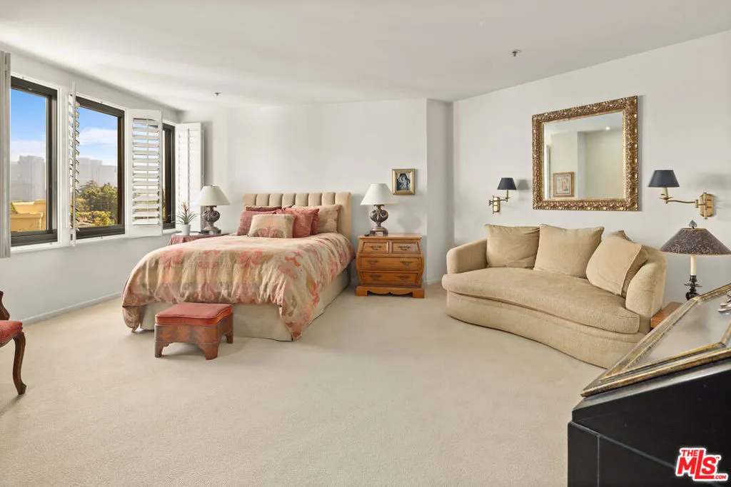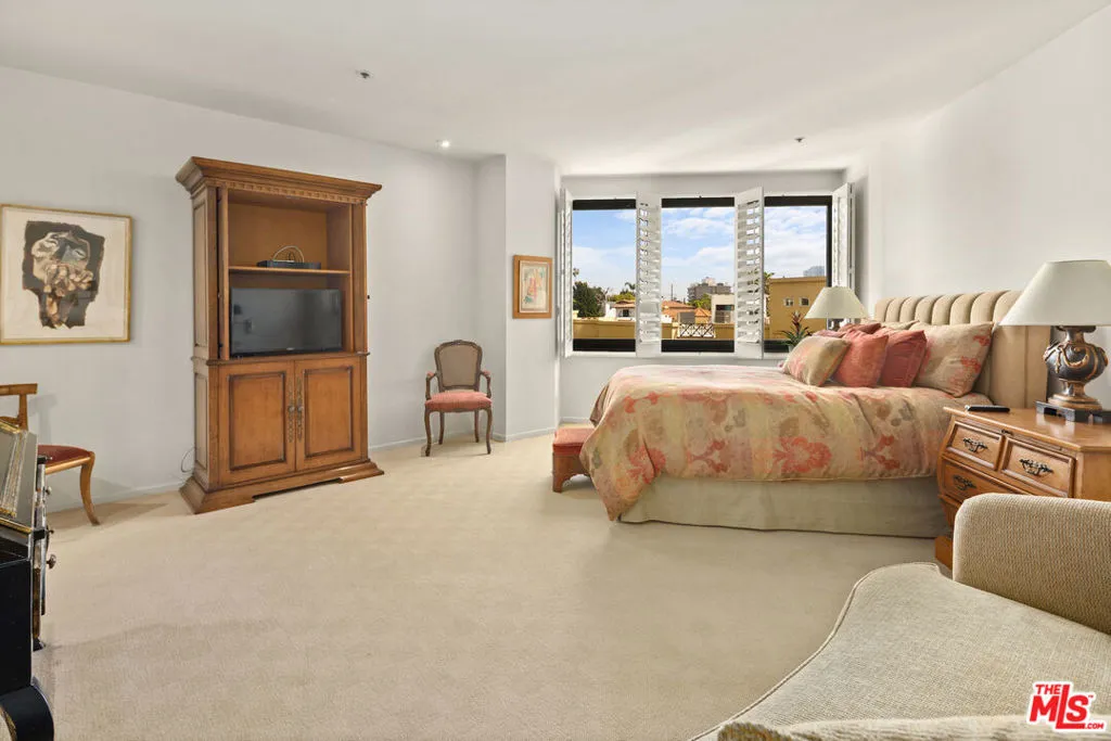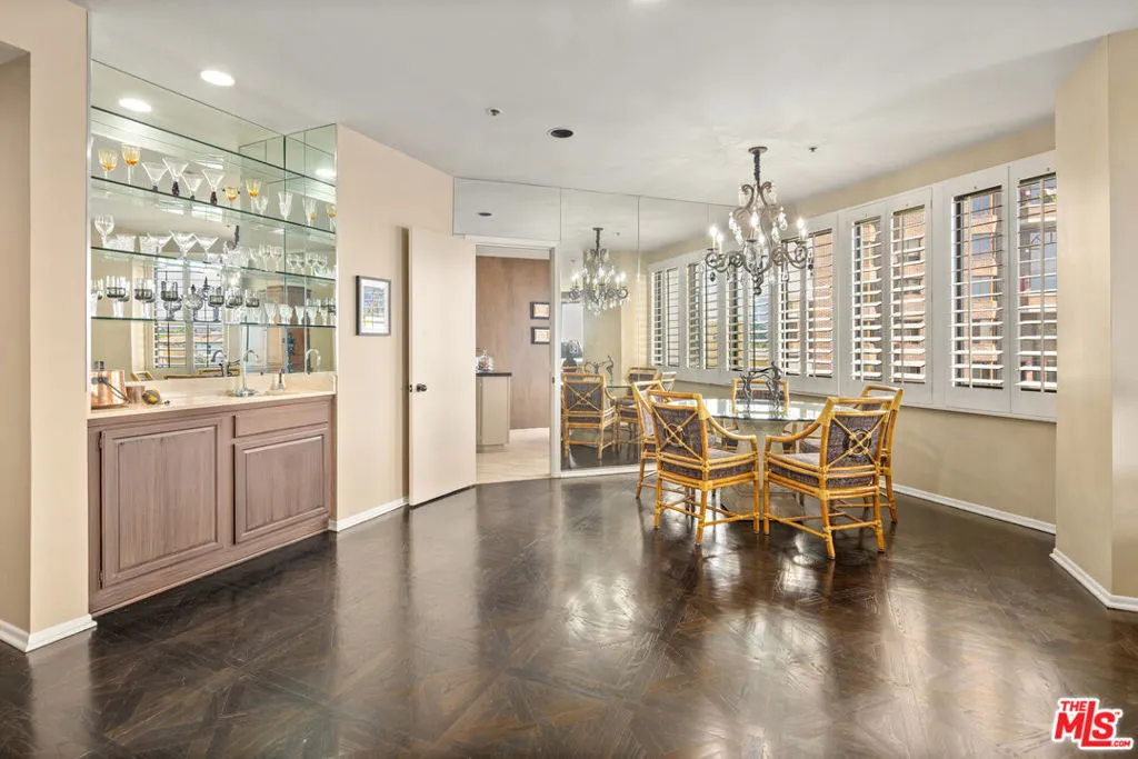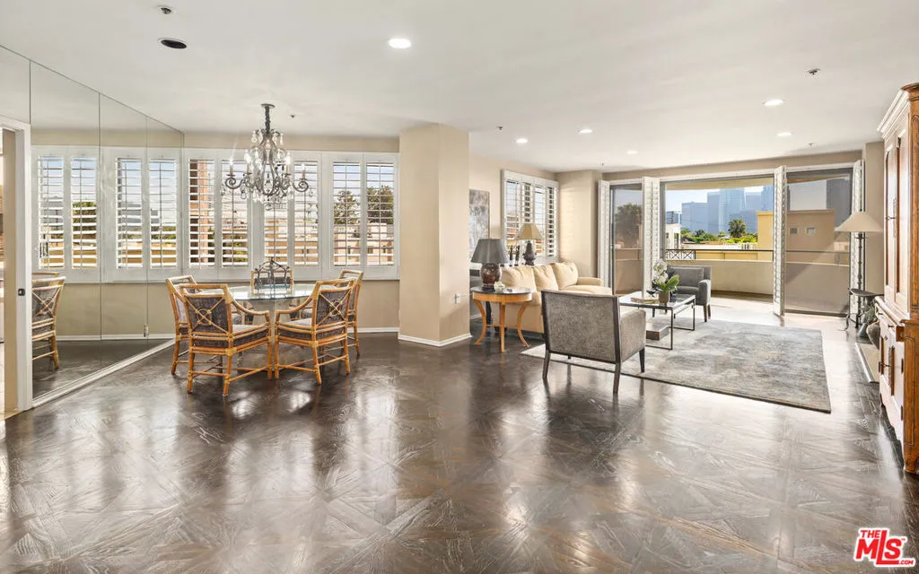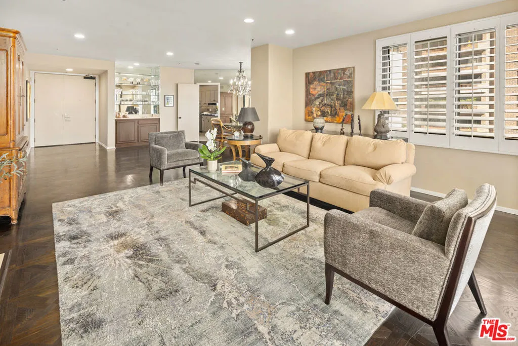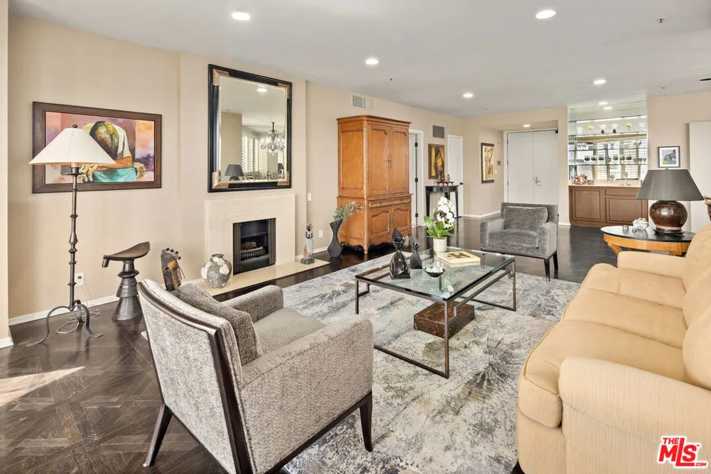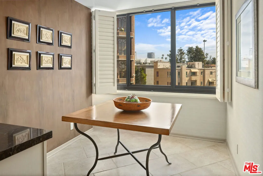 This refined 1,787-square-foot residence at the distinguished Ten-Five-Sixty presents an elevated approach to Wilshire Corridor living. Offering two bedrooms and two and a half baths, the condominium provides a serene sanctuary above the city's rhythms. The building's recently renovated lobby sets an elegant tone, while the residence itself unfolds through handsome double doors into a thoughtfully reimagined kitchen. Granite countertops, stone tile flooring, and a Sub-Zero refrigerator anchor the space, which flows seamlessly to a dedicated laundry room with generous storage. The living and dining areas embrace natural light through expansive windows beneath a soaring ceiling. Original custom wood-patterned floors add warmth and character, while a fireplace embellishes the room. Step onto the private balcony to discover tree-canopy views framed by the Century City skyline, an ideal setting for morning coffee or an afternoon with a compelling book. The primary suite impresses with its exceptional dressing area, featuring an enviable array of custom closets and a well-appointed ensuite bath. The second bedroom, equally fitted with an ensuite bath and built-in cabinetry, adapts beautifully as a guest room, office, or private study. Residents of Ten-Five-Sixty enjoy comprehensive white-glove services: 24-hour valet and concierge, a fitness center, pool and spa, an entertaining lounge with catering kitchen, EV charging, two assigned parking spaces, and dedicated storage. HOA dues encompass all amenities plus water, gas and waste service. The location places you moments from the dining, shopping, and cultural offerings of Westwood, Brentwood, Santa Monica, and Beverly Hills. Here, attentive service meets sophisticated living, with views that captivate from sunrise to the glittering evening skyline.