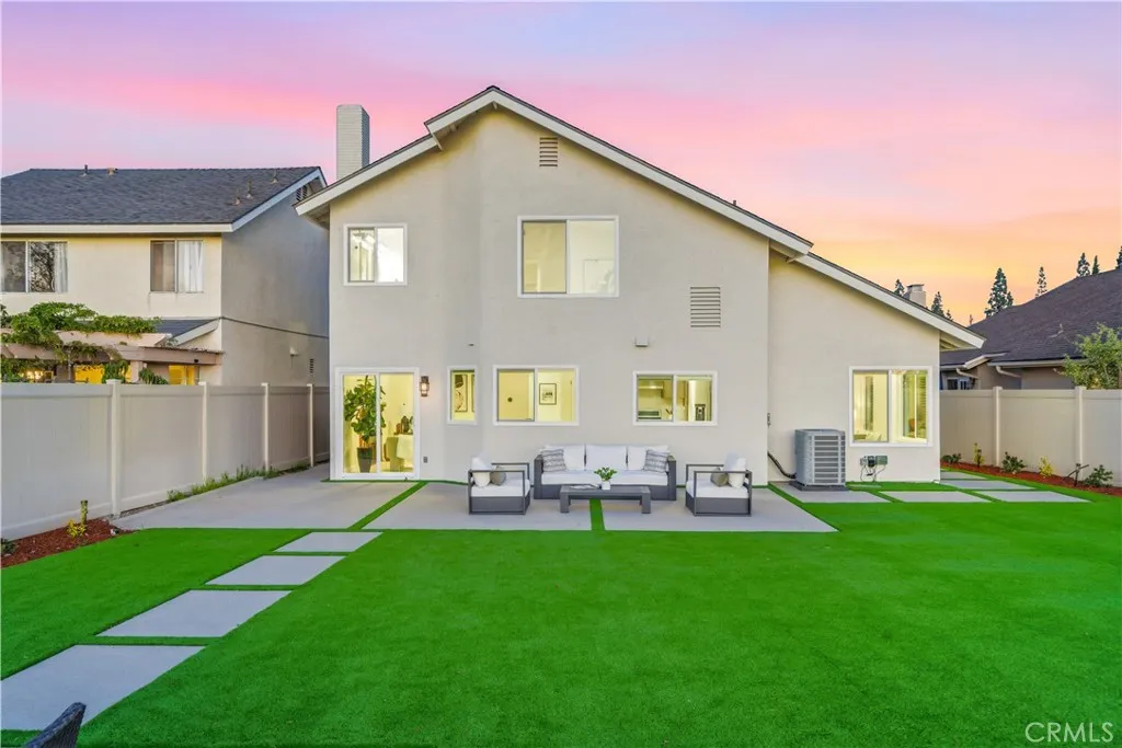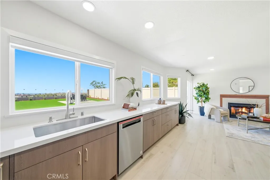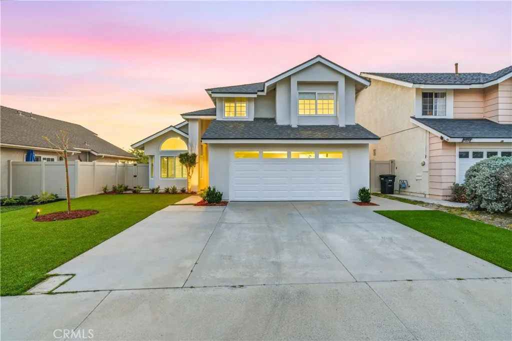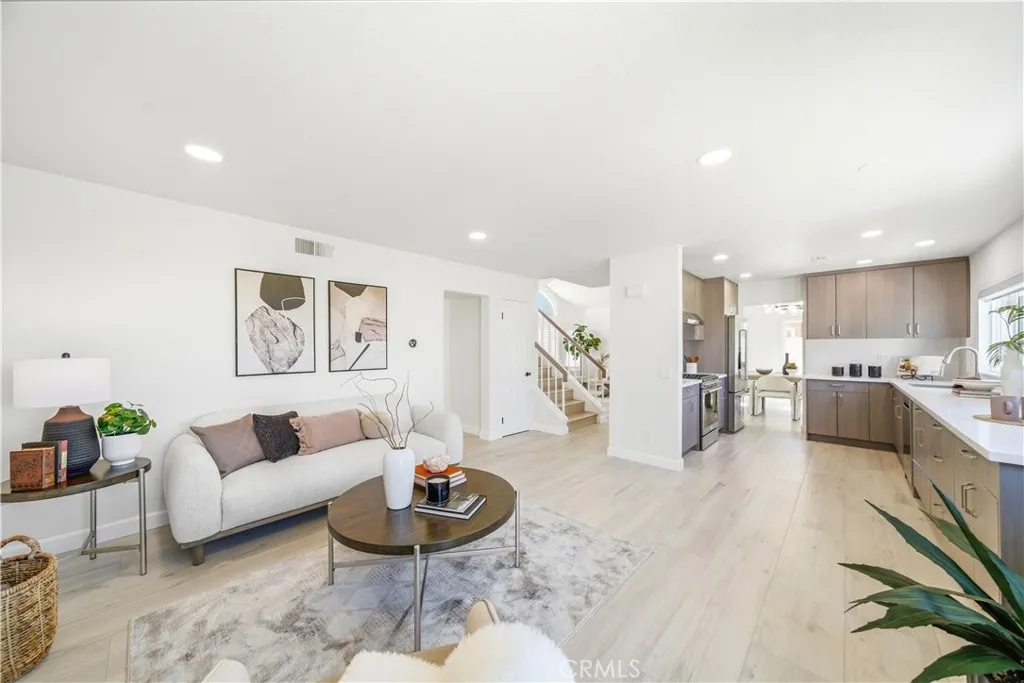 Showcasing sweeping city lights, hills and sunset views is this stunning completely remodeled light and bright residence that is on one of the largest lots in the tract and is adjacent to 2 community parks. Starting with striking low maintenance curb appeal, there are turf lawns and manicured planter beds which lead into the breathtaking formal living and dining room spaces which have views out to the expansive turf yard and to the panoramic views beyond and amazing light and a space. Clean and fresh the tone is set and with laminate wood floors that continue throughout the home, bright neutral paint and upgraded everything making this home the definition of turnkey. Off the dining room is a fully renovated kitchen featuring chic, updated cabinetry, quartz countertops, all new hardware, recessed lighting, an abundance of prep and storage space and stainless-steel appliances. This opens to a casual eat-in area and a spacious family room which has great light from a large glass door out to the view yard that allows for enviable indoor/outdoor living. A guest bath and garage access completes the lower level. Upstairs there is a small landing, perfect for a desk, and to the left is the primary suite which has stunning sunset views, double door entry, great space and light, recessed lighting and a fully renovated spa-like ensuite that features a an updated dual-sink quartz vanity, updated fixtures, hardware and lighting, a privacy water closet door and large walk-in closet. Two additional bedrooms and a fully renovated guest bath complete the upper level. Out back is a worry-free turf yard with multiple seating areas defined by all new concrete pads all laid out with taking full advantage of the panoramic unobstructed view in mind. A ring of manicured planting beds surrounds the yard, and fully transparent fencing allows for truly captivating sunset views. Situated on a great neighborhood street, on a bluff high above the surroundings, this home has an attached 2 car garage, a 2-car driveway and is just minutes from great schools, fantastic shopping, dining and entertainment and is convenient to multiple commuting options. This is the one! Welcome home!