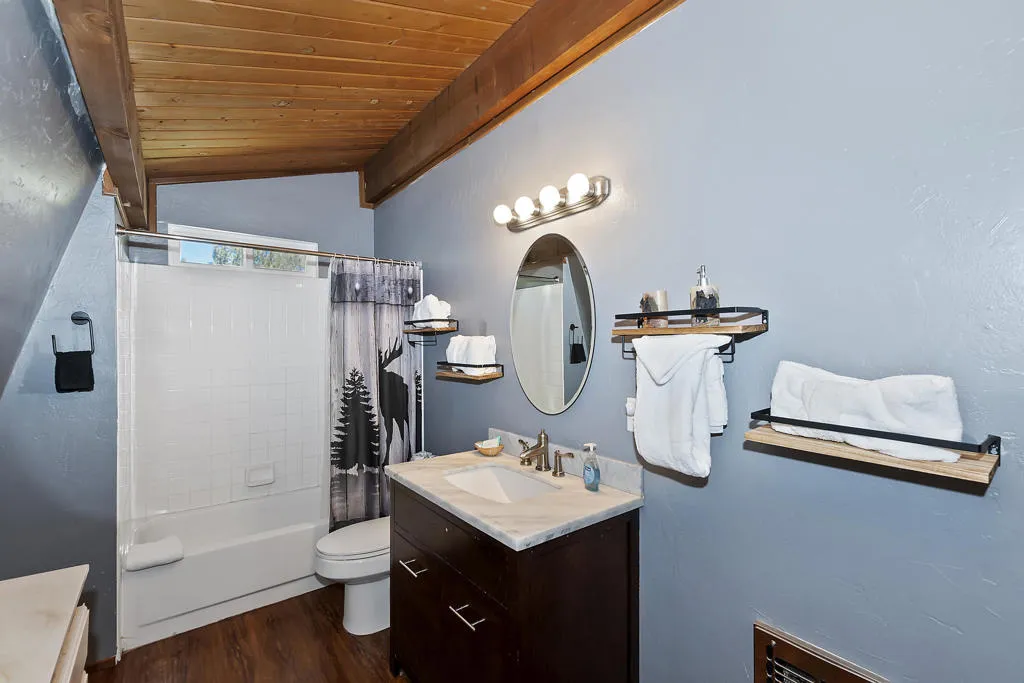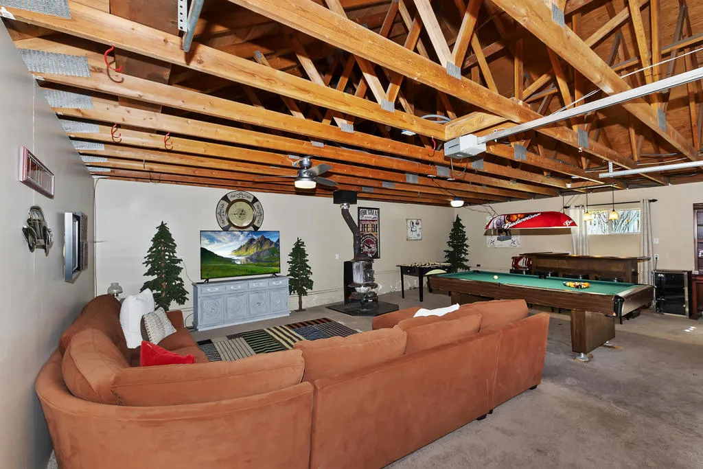 Escape to the pines! This 3-bedroom, 2-bath mountain retreat perfectly balances rustic character with modern updates. Located just a stone's throw from The Village, Big Bear Lake, and National Forest trailheads, the location is unbeatable for year-round adventure. The interior features an open-concept living space anchored by a classic stone fireplace and an updated kitchen with sleek countertops and bar seating. The real showstopper is the expansive, fenced backyard--a quite oasis featuring a multi-level deck, string lighting, a fire pit, and a horseshoe pit. The converted garage serves as a massive game room with a bar, pool table, and foosball, offering the ultimate entertainment space. Complete with a three-car driveway (RV/Boat parking included!) and a charming front porch swing, this cabin isthe quintessential Big Bear getaway.