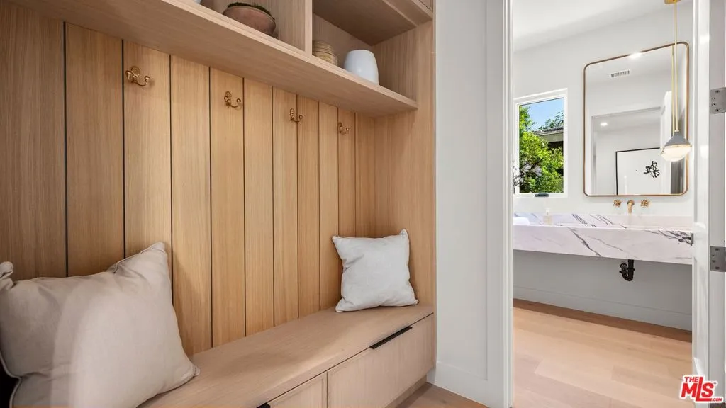 This newly constructed modern residence in the heart of prime Mar Vista offers approximately 4,134 square feet of refined living space with 5 bedrooms and 4.5 baths, blending clean contemporary design with warm, elevated finishes. Sun-filled open living spaces are framed by expansive windows and dramatic Fleetwood pocket doors, creating seamless indoor-outdoor flow that embodies the quintessential California lifestyle. A thoughtfully designed mudroom-style entry closet adds both style and everyday functionality. At the center of the home, the chef's kitchen showcases stunning Taj Mahal quartzite, custom rift oak cabinetry, and top-of-the-line Thermador appliances, complemented by a sleek butler's pantry for effortless entertaining. Natural stone finishes continue throughout the spa-inspired bathrooms, adding a sense of understated luxury. An elegant dining area flows into the spacious family room, highlighted by custom plaster built-in shelving and integrated audio. Built-in speakers extend throughout the home, enhancing both daily living and entertaining. A private main-level guest suite provides ideal flexibility for visitors, a home office, or multi-generational living. Upstairs, the luxurious primary suite features vaulted ceilings, a spa-like bath with an oversized walk-in shower, a custom walk-in closet, and beautifully curated finishes. Outdoor living areas are designed for year-round enjoyment with inviting lounge spaces, while wired security cameras offer added peace of mind. Ideally located just minutes from Venice, Abbot Kinney Boulevard, Santa Monica, and Culver City, as well as Mar Vista's popular dining and shopping destinations, this exceptional residence offers the perfect blend of modern design, comfort, and Westside convenience.