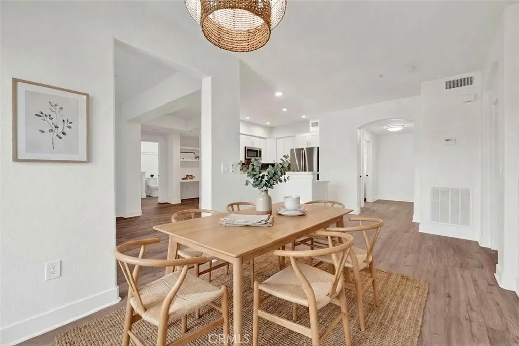 Welcome to this beautifully remodeled top-floor 3-bedroom, 2-bath residence offering modern upgrades, a bright open layout, and resort-style amenities in a prime Valencia location. This spacious home features new interior paint, luxury vinyl wood-plank flooring, and new carpeting, creating a fresh, move-in-ready feel. The updated kitchen showcases brand-new GE stainless steel appliances, white cabinetry, and a custom tile backsplash, all opening seamlessly to the living room and separate dining area. A breakfast counter provides additional seating, while the built-in office nook offers the perfect work-from-home space. Enjoy effortless indoor-outdoor living with a private balcony just off the dining area. The primary bedroom includes an en-suite bathroom with dual sinks and a walk-in closet. Two additional bedrooms offer ample closet space and comfort. A separate laundry room with washer and dryer adds convenience, and the controlled-access parking garage provides two assigned parking spaces. Residents enjoy an array of resort-style amenities, including a pool, spa, fitness center, clubhouse, private movie theater, and beautifully maintained gated grounds. A rare opportunity to own in one of Valencia’s most walkable and desirable communities. One or more photos have been virtually staged.