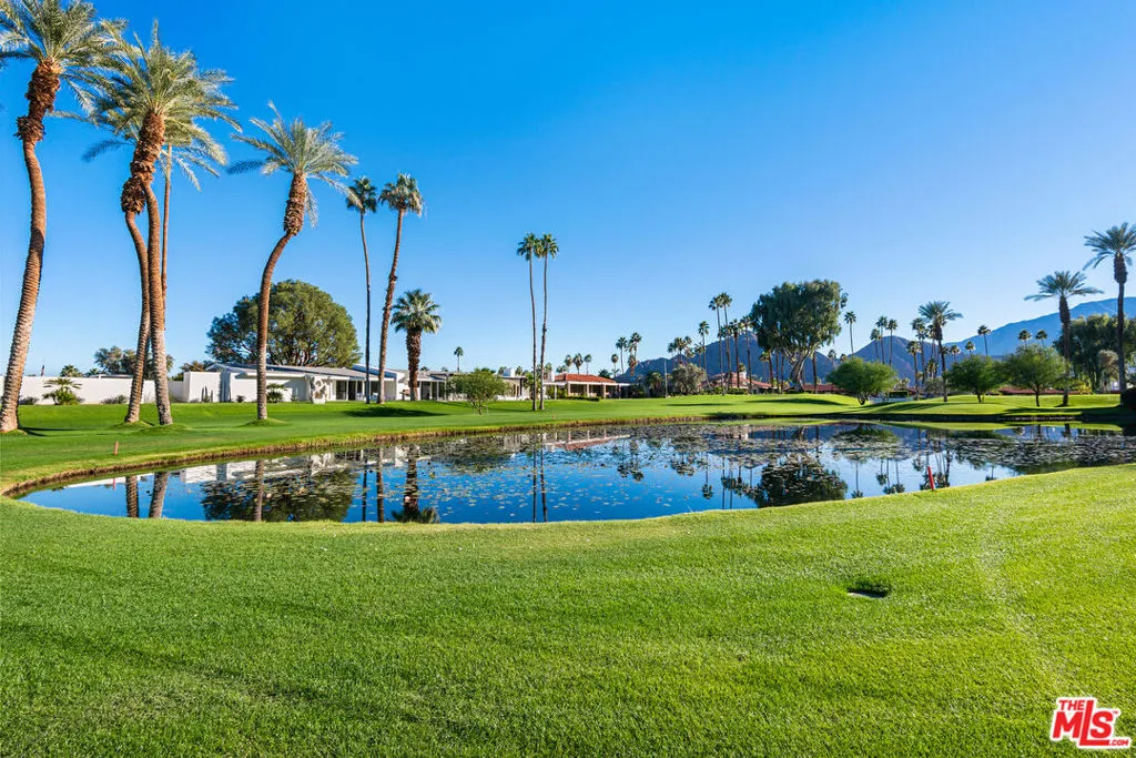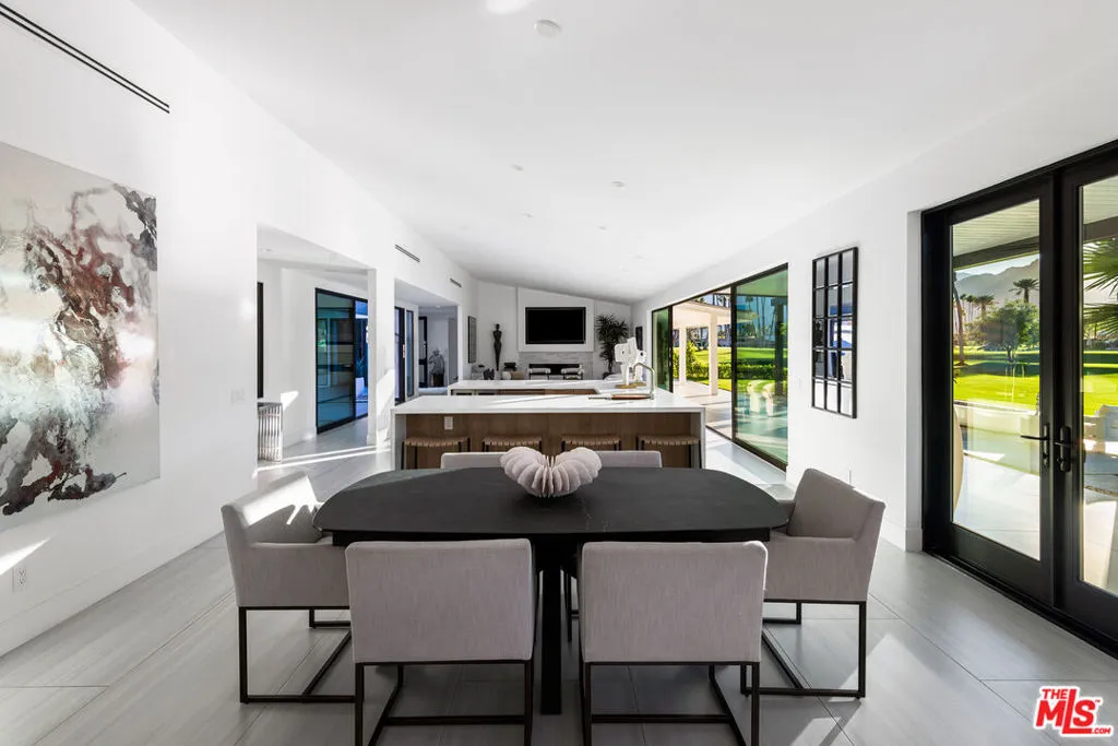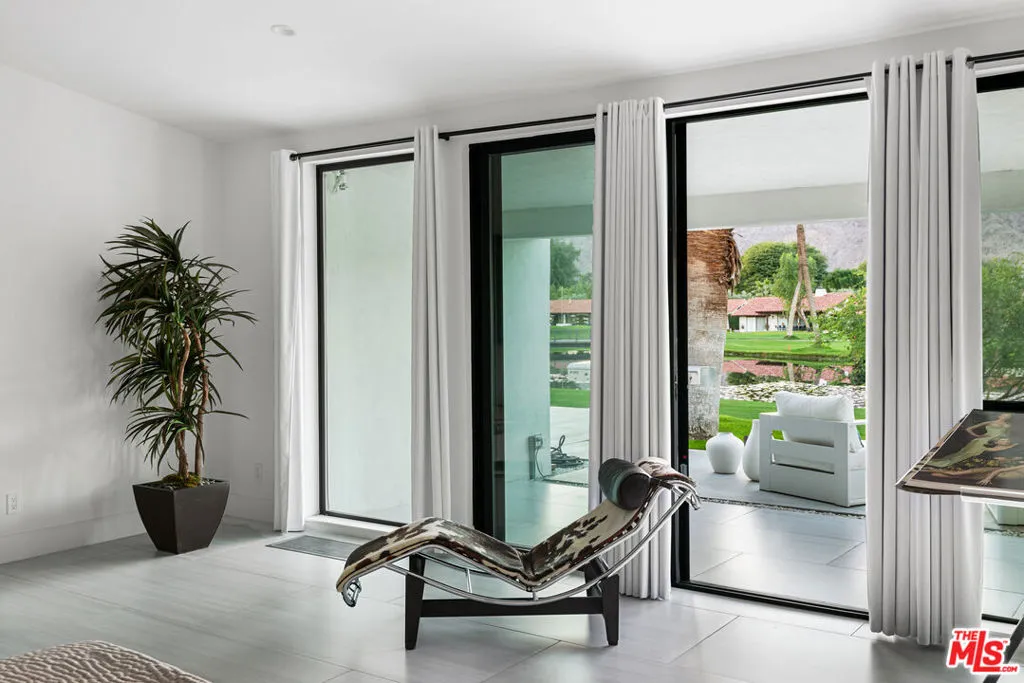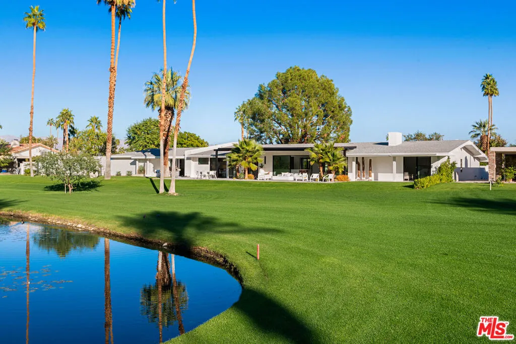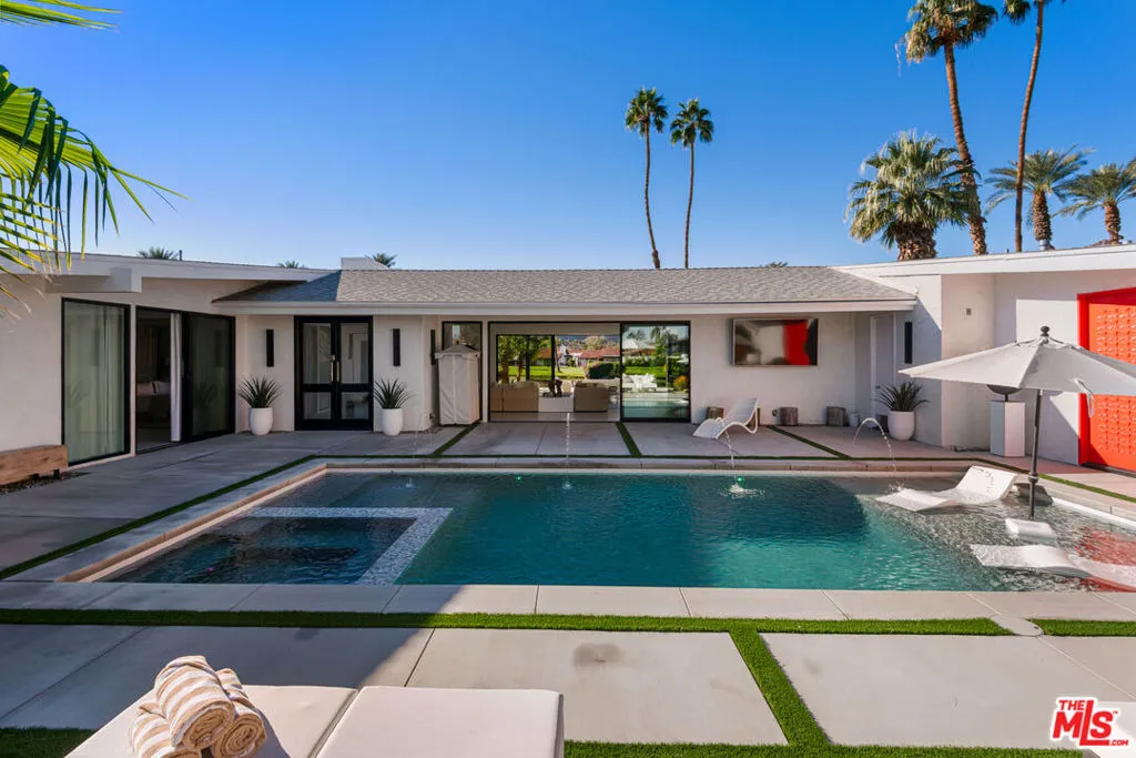 This contemporary desert masterpiece seamlessly blends modern luxury with wellness focused living. Set on a rare double lot overlooking the 4th fairway of The La Quinta Country Club, this nearly 5,000 square foot retreat offers five en suite bedrooms, six baths, and sweeping mountain views. Originally built in 1970, this iconic Steve Chase residence has been thoughtfully reimagined with sleek finishes and state of the art upgrades throughout. Expansive Fleetwood sliding doors create effortless indoor outdoor living, opening to a private courtyard featuring a saltwater pool with tanning ledge, four fountain features, spa, cold plunge, and infrared sauna. The chef's kitchen is equipped with Thermador appliances including double ovens, dual dishwashers, a gas cooktop, and built in refrigerator, complemented by European cabinetry and a walk-in pantry. A sophisticated wet bar with wine refrigerator, ice maker, and dual beverage refrigerators makes entertaining both elegant and effortless. Two spacious guest suites are located in the southern wing, while the northern wing hosts the primary suite along with two additional suites, ideal for use as a den, office, or media room. The primary suite is a true sanctuary, offering a soaking tub, oversized shower, steam shower, private outdoor spa and garden, and a custom walk-in closet. Offered turnkey, this architectural gem delivers luxurious amenities, impeccable design, and breathtaking views. The expansive double lot of nearly half an acre provides ample space for a casita, ADU, or secondary garage, making this an exceptional opportunity within one of the Coachella Valley's most coveted golf communities.