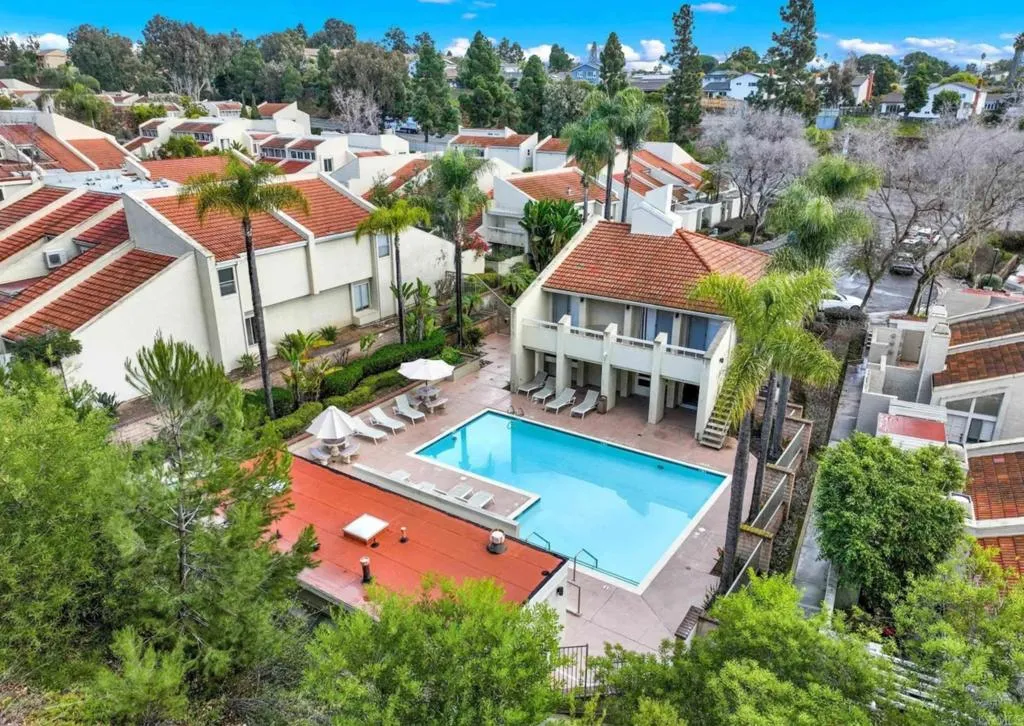 Welcome to this very desirable, ready to move in, 914 sq ft two story end unit offers privacy and a spacious floor plan in The Villas at University Park located in the University City. The complex is close to UCSD and public transportation which is ideal for UCSD college students. The floorplan has vaulted ceilings upstairs and downstairs giving the unit an open and spacious feeling. This unit is on the corner, so it has extra windows and light. It has been upgraded with a city permitted air conditioning system. The kitchen has beautiful maple cabinets; granite countertops and the washer and dryer are inside of unit in an oversized downstairs bathroom. The upstairs bedroom has its own full bath and a large walk-in closet. The front entry has an oversized coat closet, and the patio has a built-in storage shed. The stunning modern Spanish architecture is accented by trellises and tile roofs and surrounded by tropical palms and flowers that grace and canopy the winding paths and walkways. Beautiful community pool and spa, large clubhouse with gym, billiards, sunken fire pit lounge & party facilities. Ideally located close to shops & restaurants at Westfield UTC Mall, beaches of La Jolla, UCSD, hospitals and business parks, close to freeways. Don't miss out on the opportunity to own this gem!