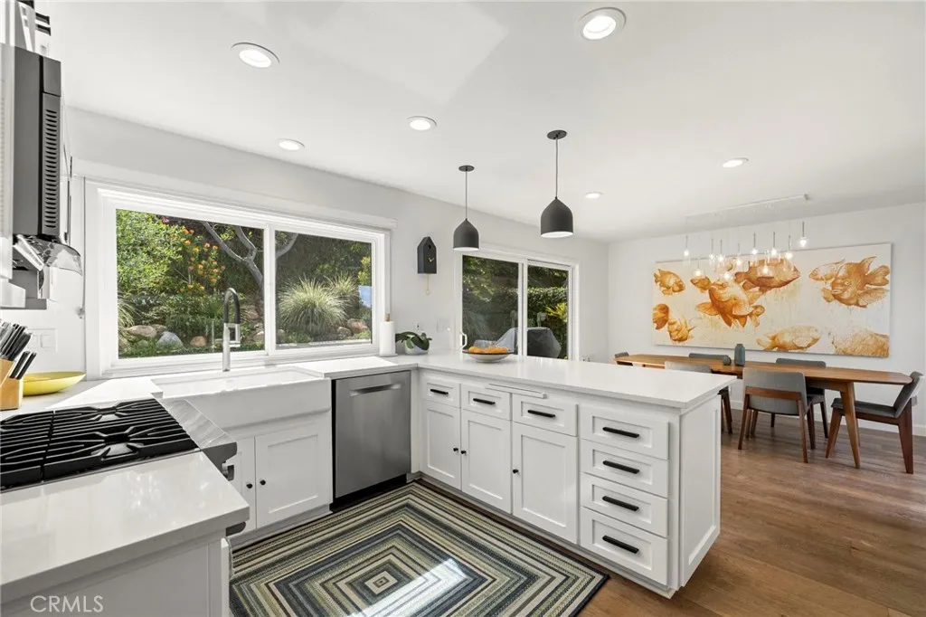Modern design meets Laguna living at 3121 Bern Drive. Situated in desirable Top of the World neighborhood just up Park Avenue from downtown Laguna Beach. A rare Laguna find of large flat lawn with mature trees and gardens combined with ocean and Catalina Island view. Versatile floor plan that allows for main floor living if preferred with all conveniences on the main floor and no steps to access the home. Stone pathway with green plantings leads to a custom front double door with glass panes under sleek redwood siding design. The high vaulted main room enjoys an ocean and Catalina view and a gas fireplace with painted brick surround. The front dining area has built-in bench seating with storage, modern chandelier and floating wall shelving. Every room has a view to the green spaces surrounding this home, affording privacy combined with nature. The gourmet kitchen features Quartz counters, subway tile backsplash, Kohler farmhouse sink with gooseneck fixture, custom cabinetry and top of the line appliances including Viking gas range & microwave, Bosch dishwasher, new LG French door refrigerator/freezer. Dedicated dining room with glass pendant chandelier, this room can dual as a den/office, has kitchen bar seating and wonderful breezes through French & sliding glass doors that connect to the outdoor areas. The lush back patio with yard has flowering plantings, built-in gas fire pit, seating. The main floor primary suite remodeled with porcelain tile shower, dual Carrara marble vanities, walk-in closet with solid maple custom crafted organizers. An additional bedroom, remodeled half bathroom and separate laundry room complete the first level. Upstairs are three bedrooms and a remodeled bath with shower over tub. The corner upstairs bedroom has been enhanced by the addition of French doors to an ocean view deck with brilliant redwood material, glass rail partitions, framing stunning sunsets and Catalina Island over the ocean. Fiber optic underground wiring at this property has been completed for highly enhanced connectivity. The oversized driveway fits up to three vehicles and the two car garage provides direct access into the house. Alta Laguna Park & open space trails are just blocks away, providing pickle ball and tennis courts, park, playground and fields. Bern benefits as one of the most central locations to all K-12th grades with award winning Top of the World Elementary, Thurston Middle and Laguna Beach High School accessed within minutes.