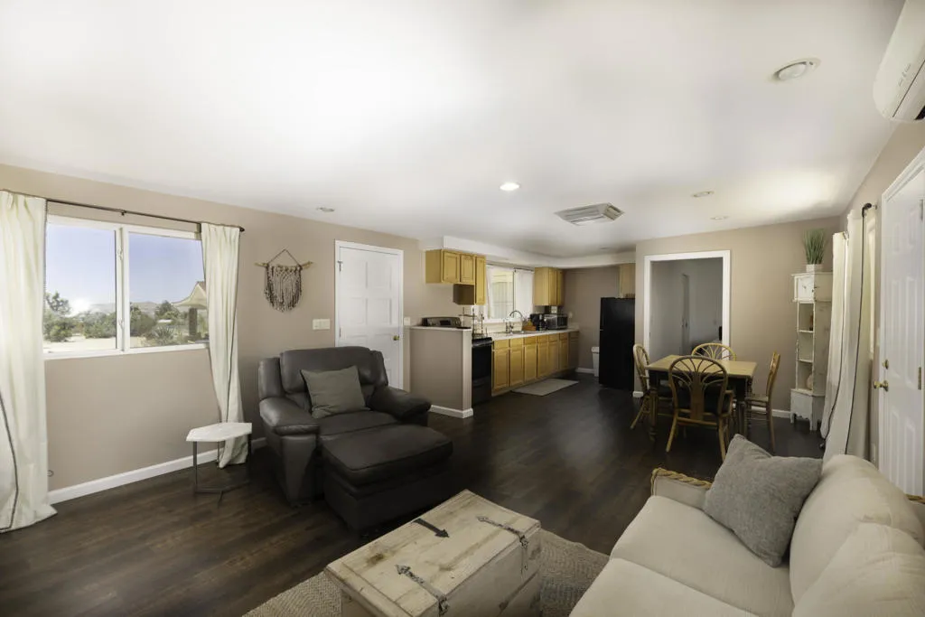 Recent major price reduction. Rare fully fenced 3-acre property in Yucca Valley offering privacy and versatility with backyard access near Joshua Tree National Park. The property includes two detached homes, a grandfathered approximately 2,500 sq ft barn, and a 6-stall stable, providing a variety of possible uses.The main residence features 3 bedrooms and 2 bathrooms with updated laminate flooring and fresh interior paint. A detached 1 bedroom, 1 bathroom casita has been rebuilt and is currently used as a short-term rental, offering potential income opportunities.Additional features include a built-in charcoal/wood BBQ, approximately $40,000 in recent improvements including exterior paint, landscaping, and resurfaced cement areas, and an owned solar system servicing the property. The grounds are fully fenced and include a private oversized electric entry gate with multiple access points.Located in a designated Dark Sky area, the property offers excellent stargazing and a peaceful desert setting. The home has paved road access and is located just minutes from town.This property may be suitable for a variety of uses including equestrian, multi-generational living, investment, or a private desert retreat.