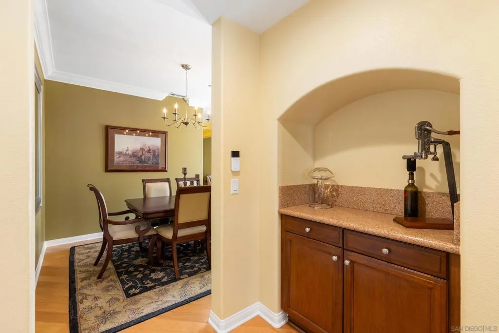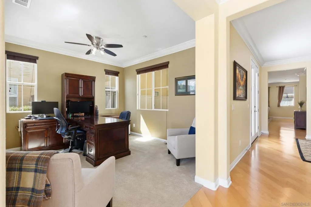 Located in a highly sought-after 4S Ranch neighborhood within the award-winning Poway Unified School District, this upgraded home features owned solar, a highly desirable floor plan, and seamless indoor-outdoor living. The interior showcases 9-foot ceilings downstairs with 8-inch crown molding and engineered pecan wood flooring installed on a diagonal. The downstairs family room offers a cozy fireplace and opens to the chef’s kitchen featuring stainless Thermador appliances, a large center island with Silestone countertops, walk-in pantry, and breakfast area with French doors opening to the backyard. The backyard features beautiful hardscaping, pergola-covered patio, tranquil fountain, and putting green ideal for outdoor living and entertaining. A charming interior courtyard off the dining room provides an additional private outdoor retreat. Upstairs, the primary suite offers crown molding, two walk-in closets, and a spa bath with dual vanities, soaking tub, and large walk-in shower. One secondary bedroom is ensuite, ideal for guests. Additional features include dual-zone AC, custom window treatments, French doors with built-in blinds, ceiling fans, fire sprinklers, upstairs laundry with sink and hanging bar, and a three-car tandem garage. Ideally located near parks, shopping, restaurants, library, hiking trails, and Pioneer Park offering expansive green space, basketball courts, and a splash pad. Exceptional 4S Ranch location within the award-winning Poway Unified School District, this beautifully upgraded home offers owned solar for energy efficiency and cost savings, a highly desirable floor plan, elegant finishes, and outstanding walkability to parks, shopping, restaurants, and community amenities. The spacious interior features soaring 9-foot ceilings downstairs with impressive 8-inch crown molding and engineered pecan wood flooring installed on a diagonal. The downstairs family room offers a warm and inviting fireplace and flows seamlessly into the chef’s kitchen showcasing stainless Thermador appliances, a large center island with Silestone countertops, a generous walk-in pantry, and a spacious breakfast area with French doors opening to the backyard. A downstairs bonus living room overlooking the charming interior courtyard makes an ideal work-from-home office. The beautifully designed backyard features gorgeous hardscaping, a pergola covered patio, tranquil fountain, and putting green creating an ideal setting for outdoor living and entertaining. The home also offers a charming interior courtyard off the dining room providing an additional private outdoor retreat. Upstairs, the very large primary suite features crown molding, two walk-in closets, and a spa-inspired bath with dual vanities, soaking tub, and large walk-in shower. One secondary bedroom is ensuite, offering excellent flexibility for guests or family members. Additional features include dual-zone air conditioning, custom window treatments throughout, French doors with built-in blinds within the glass, ceiling fans, built-in fire sprinklers, an upstairs laundry room with sink and hanging bar, and a three-car tandem garage. Ideally located near nearby hiking trails and Pioneer Park offering expansive green space, basketball courts, and a splash pad.