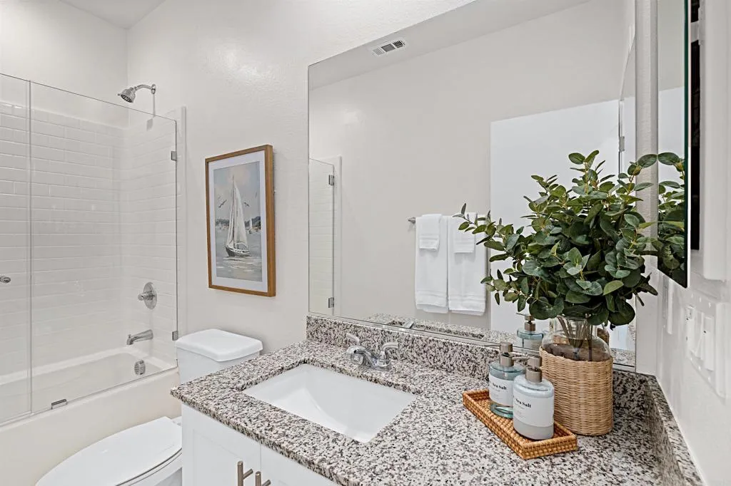 Turnkey in every sense of the word. This very well cared for and tastefully curated 1,945 square foot La Brisa corner unit blends contemporary flare and modern convenience designed for everyday living in style. With four bedrooms, three and half baths and an attached two car garage the possibilities are nearly endless. The first floor features an inviting entryway, direct garage access and a spacious bedroom with en-suite full bath perfect for guests or family. The second floor is an entertainer’s delight with a light, bright open concept floorplan. Gather in the kitchen area around the generous island, watch the big game in the family room area, enjoy morning coffee or sunset sips on the balcony or assemble the ingredients for your next gourmet meal from the oversized pantry. The third floor includes the Primary Bedroom with ensuite full bath and custom designed closet, two more bedrooms, another full bath and a thoughtfully designed laundry room. This home also features stunning LVP flooring, custom window coverings, ample storage throughout, Low-E glass windows, energy efficient appliances, tankless water heater, A/C and forced air heating and owned solar. La Brisa is a VA-approved community with resident sitting areas and conveniently located dog parks. The 14-acre plus Cesar Solis Community Park is close by with a network of trails, large grassy areas for picnics, ball fields, a full-court basketball court and a skate park. Easy freeway access puts you on the road for quick access to downtown San Diego, the beaches of Coronado Island and the International Border. The perfect setting for your next stage awaits you at this stunning home.