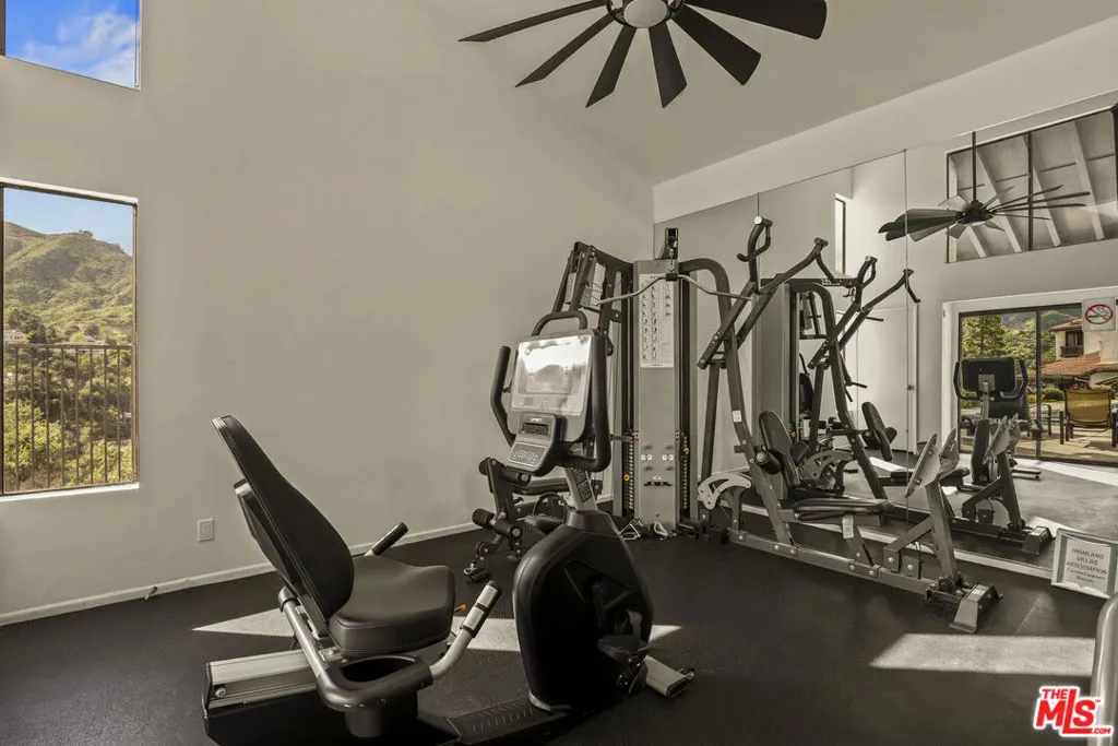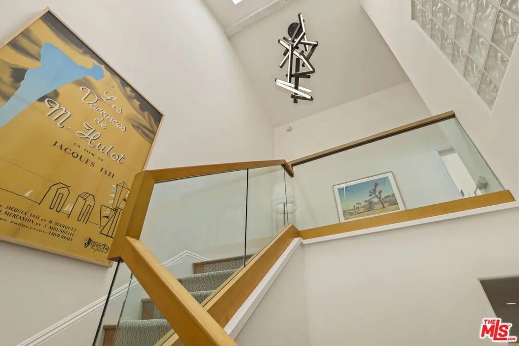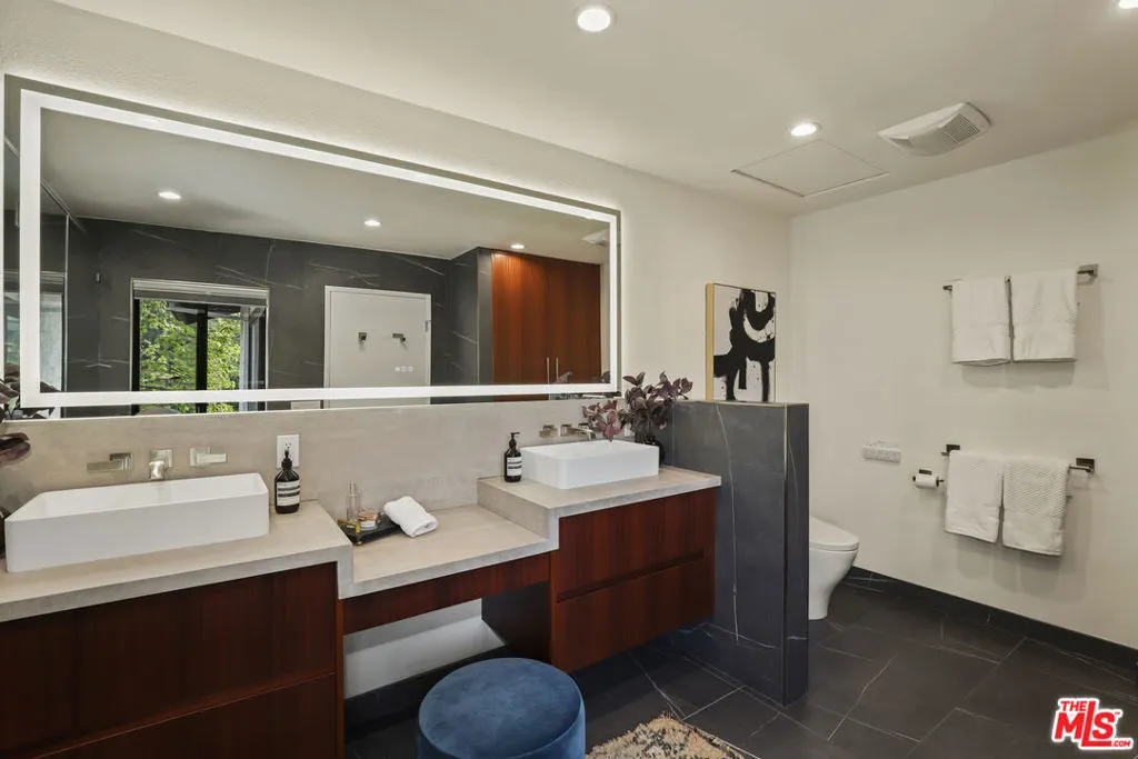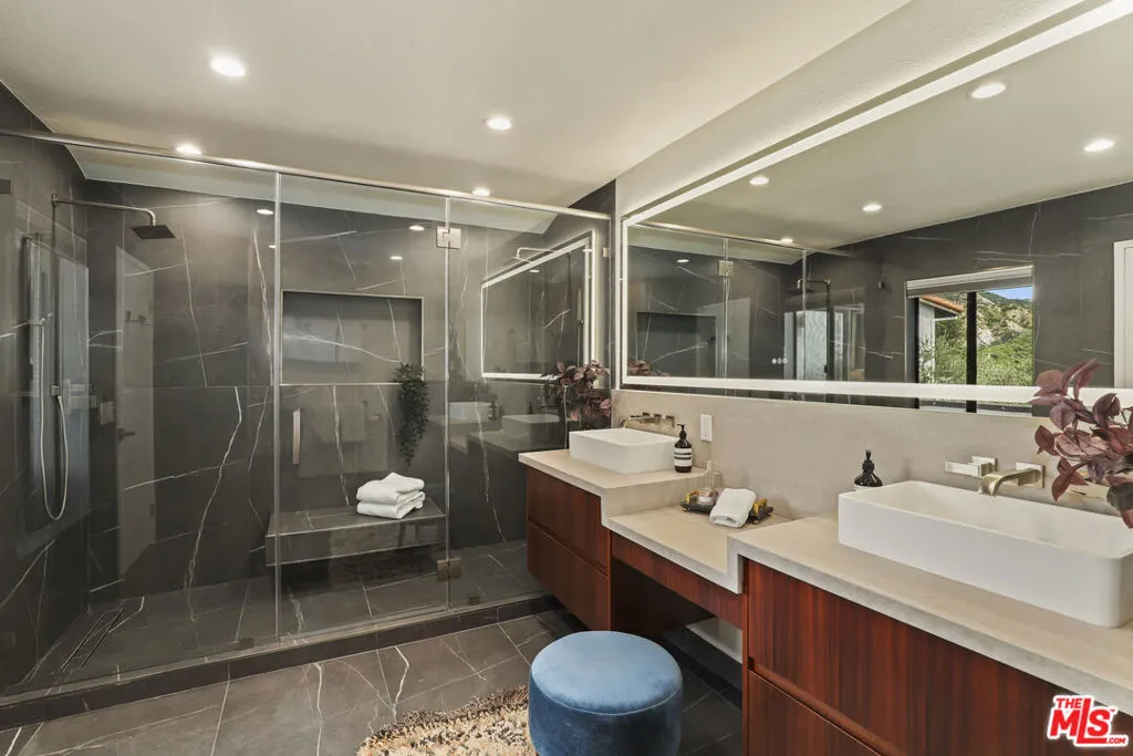 Perched in the coveted Highlands enclave of Pacific Palisades, this exquisitely updated townhome offers a refined blend of sophisticated design, modern comfort, and breathtaking canyon vistas.Sunlight pours through soaring ceilings and a dramatic skylight, illuminating the home's open-concept living spaces. The living room centers around a warm fireplace and flows effortlessly to a serene patio with new tile flooringan inviting setting for morning coffee or sunset entertaining surrounded by a beautiful botanical paradise.The state-of-the-art chef's kitchen is both striking and functional, featuring Brazilian granite countertops, rare Anegre African wood cabinetry, and premium appliances including a Viking six-burner range with griddle and KitchenAid built-in refrigerator. Custom pull-out cabinetry, a stylish wet bar, and tranquil mountain views from the kitchen complete this thoughtfully designed culinary space.Upstairs, a glass-railed staircase leads beneath a stunning skylight to the private bedroom level. The primary suite is a tranquil retreat with vaulted ceilings, a spacious cedar-lined walk-in closet, and a newly renovated spa-inspired bathroom appointed with Brizo fixtures, a Toto Washlet bidet, custom cabinetry, dual sinks, vanity table, LED backlit mirror, and a walk-in shower with dual shower heads. A private balcony captures sweeping canyon views.A secondary upstairs bedroom features its own en-suite bathroom, while an additional bedroom and full bath on the main level offer flexibility for guests, office space, or multigenerational living.Additional features include French limestone flooring, exotic hardwoods, central HVAC, designer lighting, a full-house water filtration system, new gas water heater, and a direct-access two-car garage with extensive custom storage.Residents enjoy resort-style amenities including a pool, spa, sauna, and fitness center overlooking the surrounding canyon landscape.Just moments from the boutiques, dining, and community atmosphere of Palisades Village, as well as nearby hiking trails and the beach, this home offers an exceptional blend of luxury, tranquility, and coastal lifestyle.