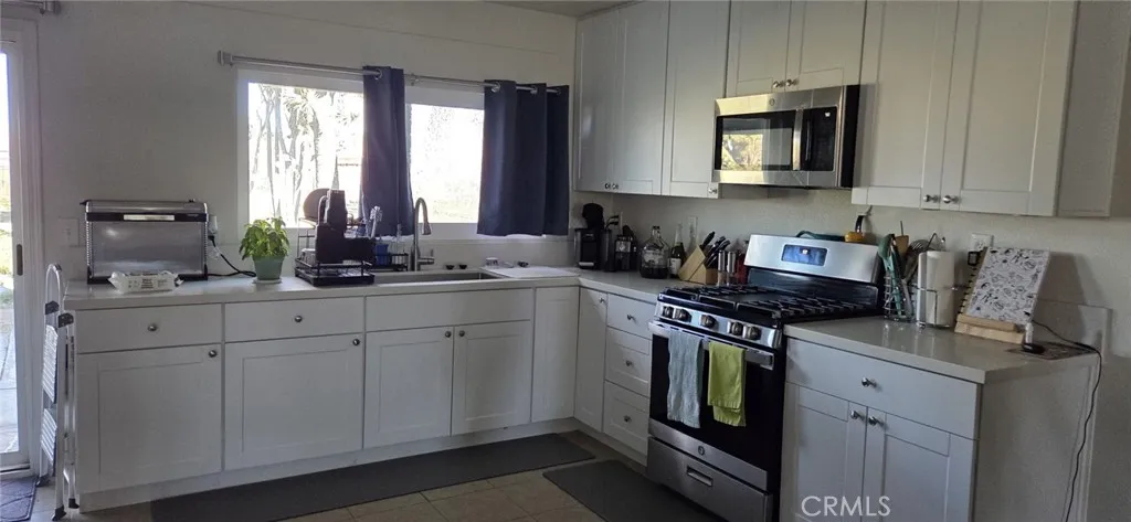 Welcome to this beautifully upgraded 3-bedroom, 2-bath home situated on an expansive lot in the heart of Yucca Valley. energy-efficient double-pane windows, and stylish laminated flooring throughout. The modern kitchen is designed to impress with updated cabinetry, sleek quartz countertops, and newer appliances including a range and microwave, while both bathrooms have been tastefully renovated with tile showers, updated vanities, and contemporary finishes. Comfort meets functionality with generously sized bedrooms, ample closet space, and a newly installed AC unit to keep you cool year-round. The attached two-car garage offers abundant storage along with a built-in workbench, perfect for hobbies or additional workspace. A gated entry opens to a spacious driveway, providing plenty of parking for guests, RVs, or recreational vehicles. Set on a large, fully fenced lot with mature trees, this property offers privacy and room to enjoy the outdoors with covered patio. Backyard provides spacious room for an ADU. Buyer is to verify ADU information with the city. Conveniently located near local shopping, dining, and schools, and just a short drive to the natural beauty of Joshua Tree National Park, this home is ideal as a primary residence, vacation getaway, or investment opportunity.