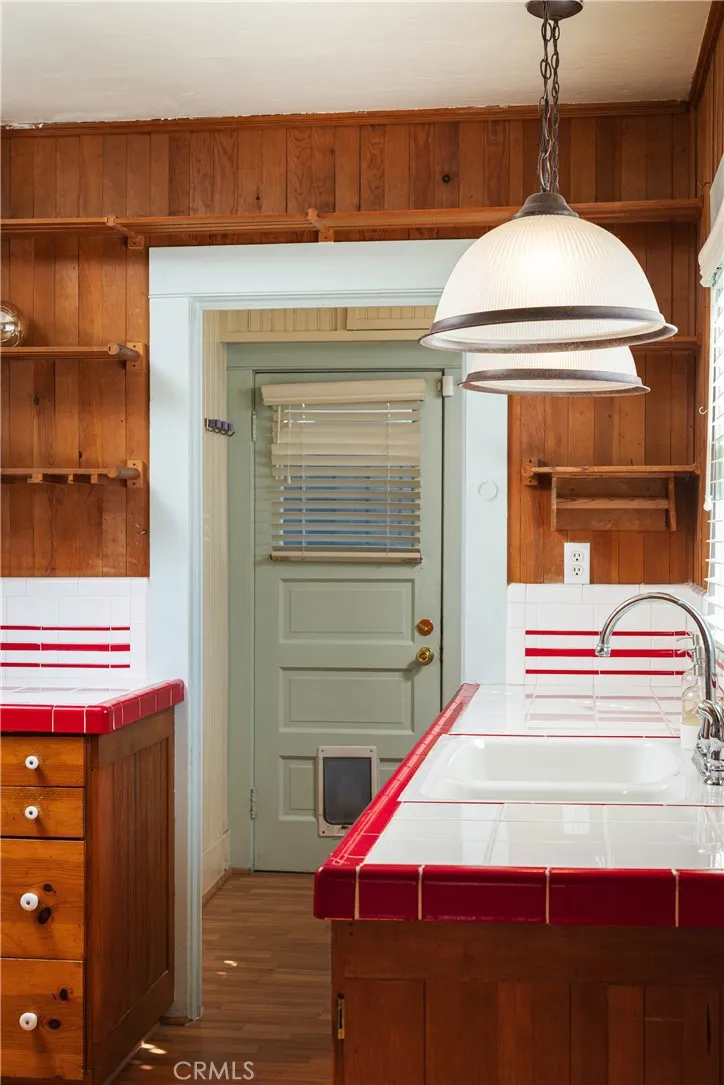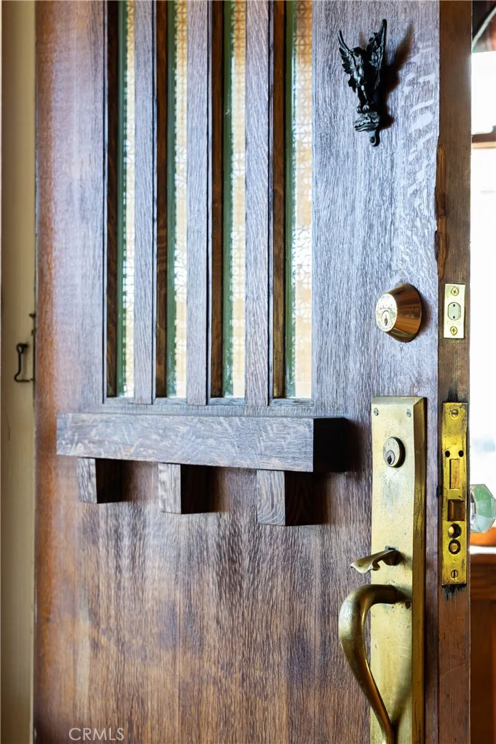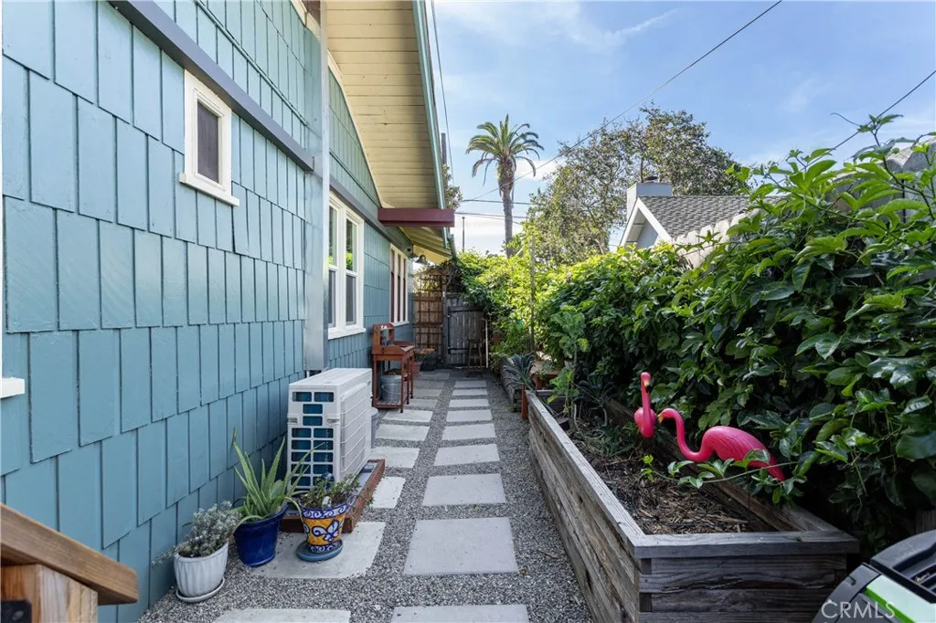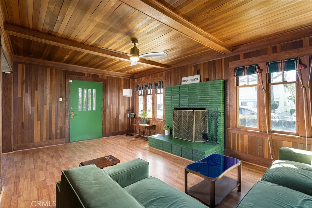 Wood shingled Craftsman Bungalow located on a corner lot in the historic district of Rose Park South. This bungalow is a few blocks to Retro Row restaurants and, and a 10 minute walk to the beach. A large fenced front yard with grass and citrus trees welcome you as you walk up to the house. Fun fact: several cacti and succulents came from Leonardo DiCaprio’s property! There is a large front porch with the original oak front door to the living room, and French doors to the dining room. The open living room and dining room feature natural wood paneling on the walls and ceilings. There is a wood burning fireplace, custom Roman blinds, and ceiling fans. The dining room features the original buffet cabinetry, and a custom swinging door with stained glass to the hallway. There is an abundance of natural light from the original wood framed windows. The kitchen has vintage wood cabinetry, and tile countertops. There is an abundance of storage space in the kitchen. The laundry room is adjacent. There is a screened back porch as well. There are 2 bedrooms total, with a larger closet in the hall between them. The first bedroom has a door to the living room. The 2nd bedroom features a custom desk area, closet cabinetry and a bookcase, along with a door to the backyard. There is a 3/4 bathroom with custom stained glass windows, tiled shower and a custom vanity. The house also has a split HVAC system and ceiling fans. *There is an ADT Alarm System, Ring doorbell, and cameras.* The bedrooms and living room have updated electrical outlets and Romex wiring. The hallway also has a pull-down attic ladder for additional attic storage access. The low-maintenance backyard has raised planters, a wooden bar, a concrete patio, and a storage shed. There is a large 1 car garage that was rebuilt with plenty of storage, and a small driveway in front of it.