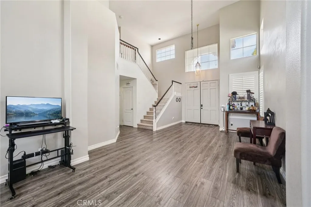 This charming home features a well-designed 4-bedroom, 3-bath floor plan, including one bedroom and a full bathroom conveniently located downstairs. The open layout offers comfortable living spaces filled with natural light and wooden shutters throughout. The living area includes a brick fireplace and connects easily to the dining area and kitchen, creating a functional space for everyday living and entertaining. The kitchen overlooks the main living area and offers pull-up seating and stainless steel appliances. The spacious primary bedroom includes an ensuite bathroom with a walk-in shower and soaking tub. A sliding glass door provides access to the backyard, allowing for easy indoor-outdoor living. The backyard backs to a greenbelt and features low-maintenance turf and a covered outdoor seating area. A private balcony overlooking the greenbelt provides an additional outdoor retreat. Additional highlights include a 3-car garage.