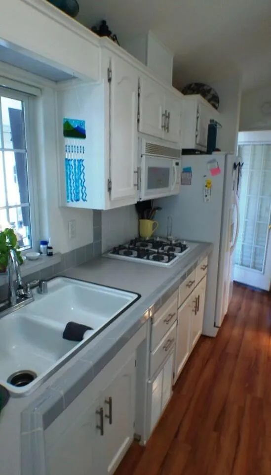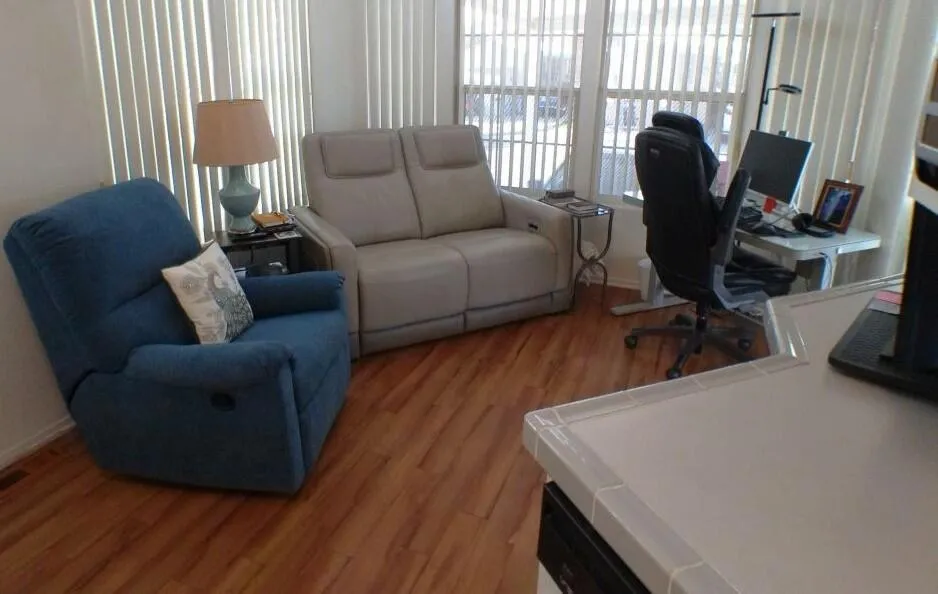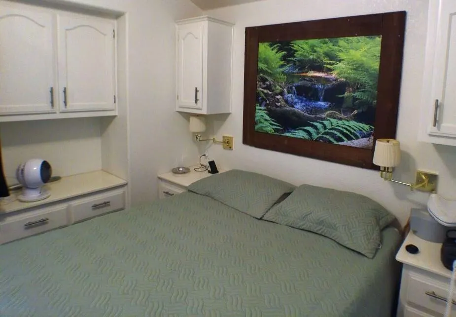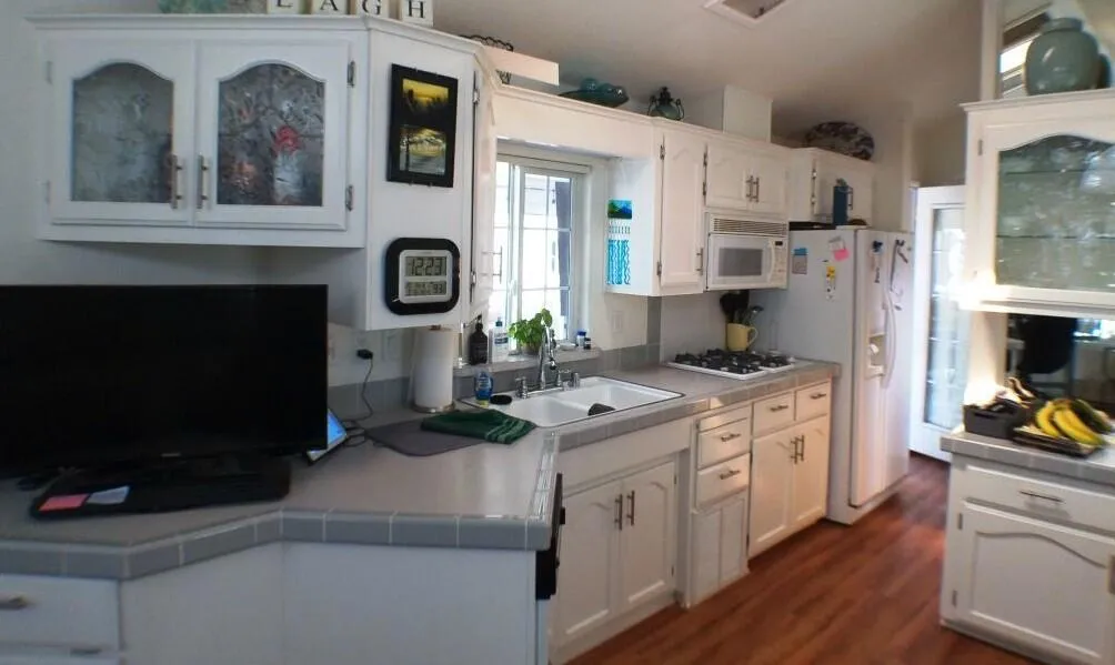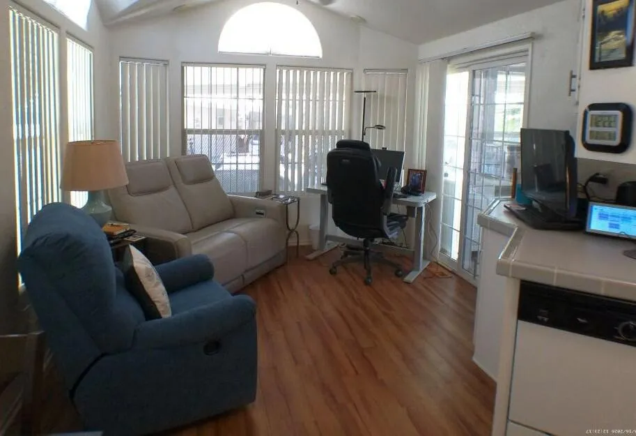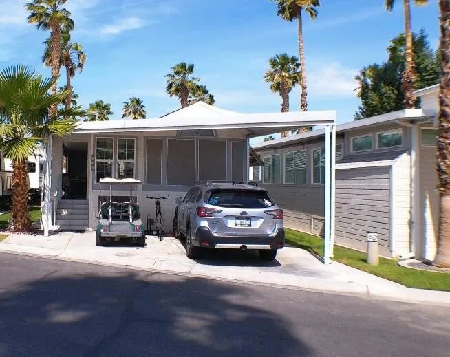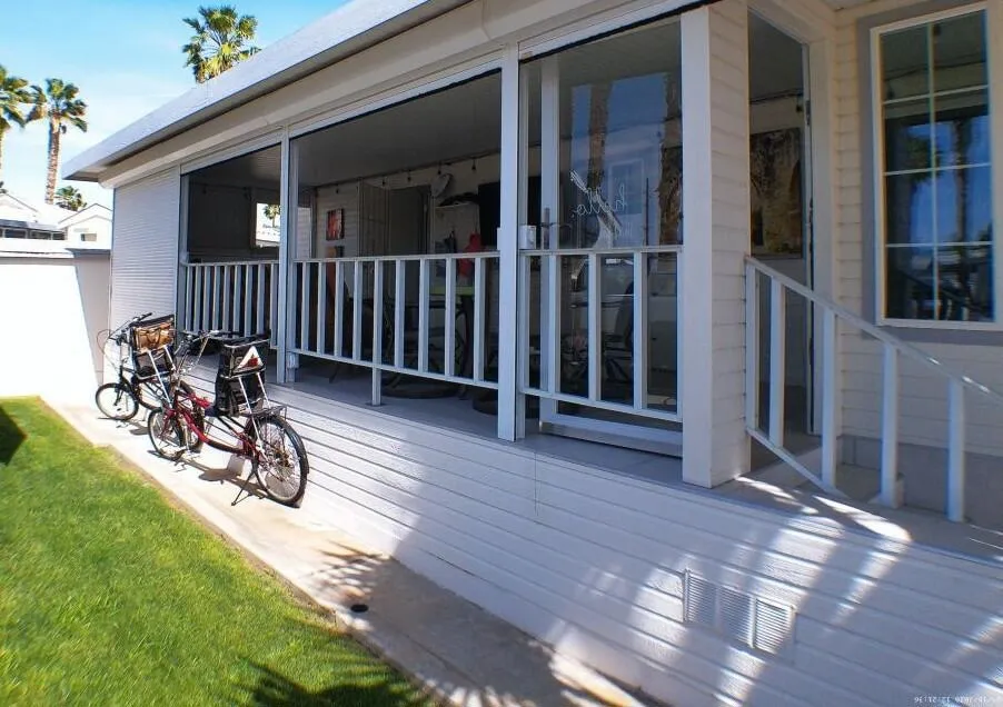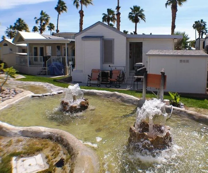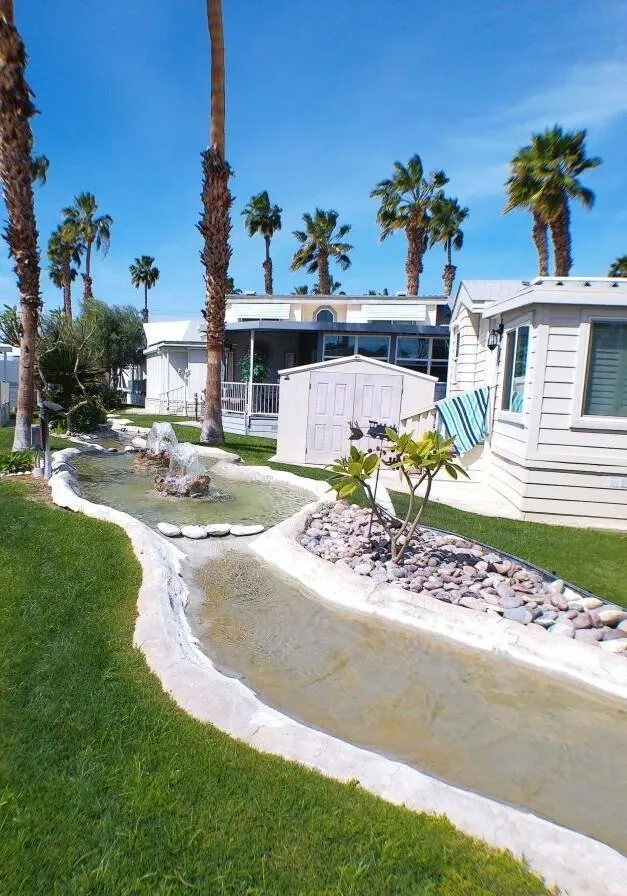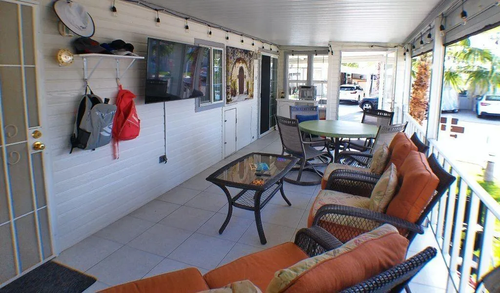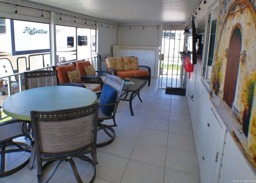 Located by the Back Gate and Clubhouse #2. It backs onto our little creek with water features behind. Wonderful Covered deck for entertaining. Tile flooring and shutters to close the deck area up in case of bad weather or just security. Entering the home, you are greeted with a very open floor plan with great Dining area, Dishwasher, Glass door cabinetry and lots of counter space. The Washer/Dryer is located on the deck at the back. Tiles adorn the flooring on deck. Lots of storage in the kitchen and bedroom. The flooring in the Park Model is laminate. Don't miss the home as it will not last in this marketplace.