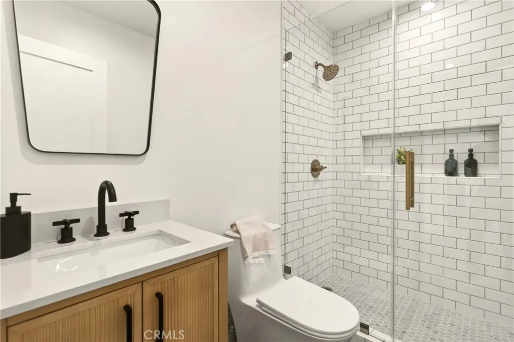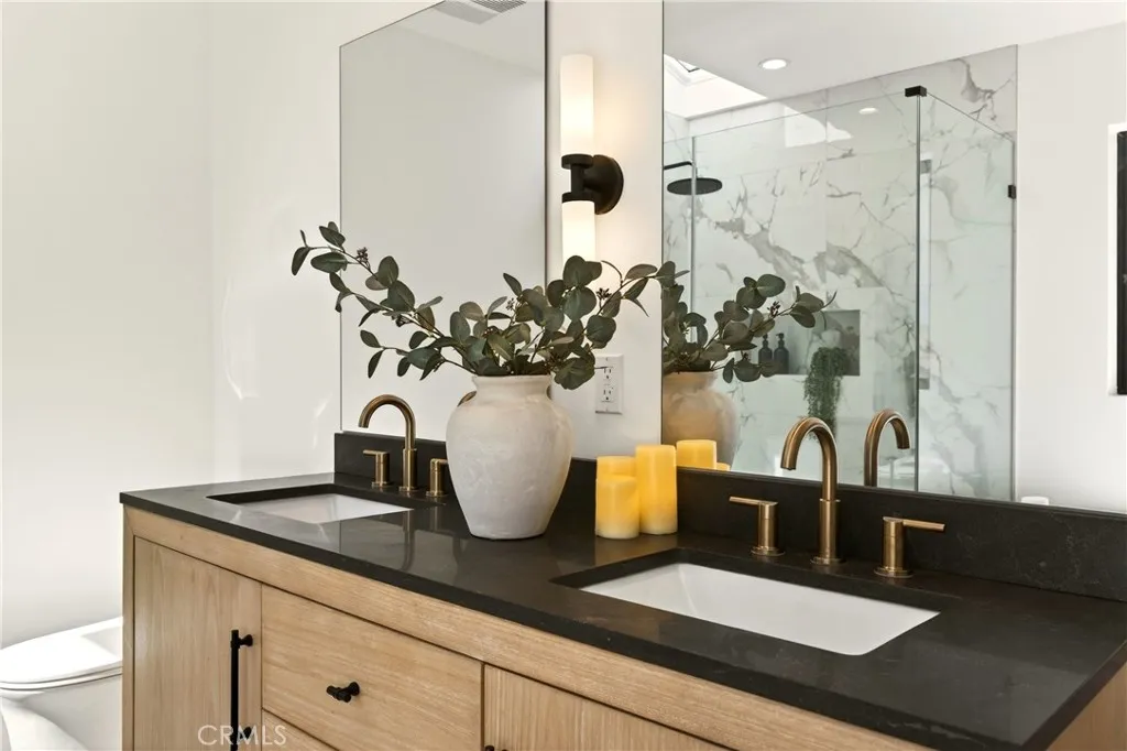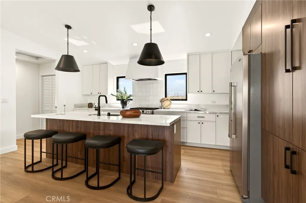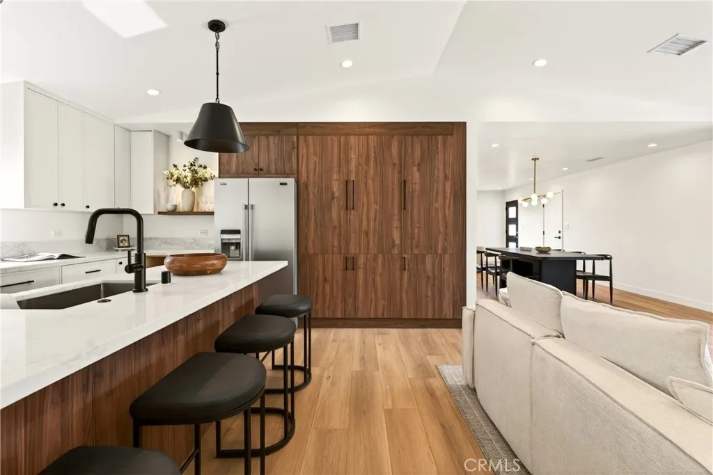 A study in modern California living, this fully reimagined Arcadia residence blends architectural intention, refined materiality, and everyday functionality into a home that lives as beautifully as it looks. Expanded with a fully permitted 920 square foot addition, the property has been thoughtfully transformed and curated by 8A Interiors, where every line, texture, and finish creates a cohesive, elevated living experience. The exterior introduces a clean, contemporary presence, smooth stucco softened by warm wood accents, framed by new landscaping, lush sod, and intentional hardscape. New Milgard windows and doors invite natural light, while updated roofing, fascia, and systems support both form and longevity. Inside, vaulted ceilings and open sight lines create a sense of volume and ease. A sculptural fireplace anchors the living space, while expansive sliding glass doors blur the boundary between indoors and out. The kitchen serves as both centerpiece and workspace, featuring clean lines, custom cabinetry, a statement island, new appliances, and elevated finishes that balance style with performance. Privately situated, the newly constructed primary suite offers a quiet retreat with a custom walk-in closet and spa-like bathroom defined by refined textures, curated lighting, and a calming palette. A complete rebuild ensures modern efficiency with new plumbing, electrical, HVAC, ductwork, and a 200-amp panel with EV capability. Wide plank flooring, layered lighting, and tailored details create a consistent design language throughout. Outdoor spaces offer a private setting with new irrigation, concrete work, vinyl fencing, and thoughtfully selected landscaping for low maintenance and visual serenity. Located minutes from Arcadia’s premier destinations and the vibrant energy of Old Town Monrovia, this is more than a renovation—it’s a complete architectural re-envisioning designed for comfort, style, and connection.