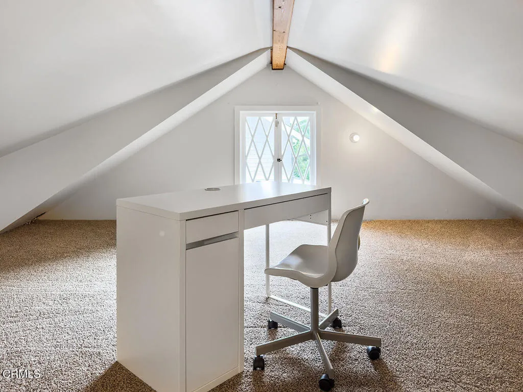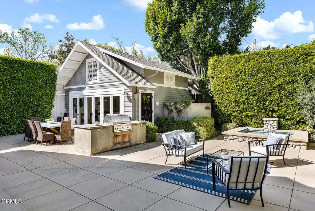 This captivating farmhouse-style residence, built shortly after the turn of the century, is situated on one of West Pasadena's most prestigious estate streets and showcases many architectural details of the era. The dramatic living room features 25-foot vaulted ceilings, a commanding fireplace, and streams of natural light through period diamond-paned windows.The dining room and butler's pantry are complete with custom built-in cabinetry, adding both charm and functionality. The generous floor plan offers four bedrooms, including a spacious primary suite with soaring ceilings and serene treetop views. An office adjacent to the living room offers a convenient workspace or library.The kitchen and family room flow seamlessly to a rear patio, creating an ideal setting for indoor-outdoor entertaining. The grounds offer a private garden setting with mature trees, natural landscaping, and towering verdant hedges. A distinctive river rock motif is carried throughout the property, from the low river rock wall and welcoming front steps leading to the expansive porch to the outdoor fireplace and spa with river rock detailing in the backyard.The garage currently serves as a large bonus room with a finished second-floor loft, providing ample storage and includes a split air system.