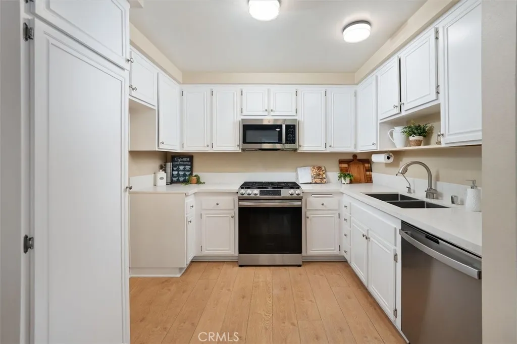 This stunning 2-bedroom, 2-bath townhome in the highly sought-after Valencia Fairways community is tucked into a quiet back corner with no front neighbors and views of the lush parklike greenbelt—creating a peaceful retreat you’ll love coming home to. A charming, greenery-filled patio sets the tone for relaxed outdoor living, perfect for morning coffee or evening unwinding. Inside, soaring ceilings and abundant natural light create an open, airy ambiance. The thoughtfully updated kitchen is a true highlight, featuring stainless steel appliances, quartz countertops, and contemporary finishes—ideal for both everyday living and effortless entertaining. Recent upgrades including Milgard dual pane windows, fresh interior paint, new carpet, and luxury vinyl plank flooring provide a crisp, modern feel throughout. Upstairs, two spacious bedrooms offer comfort and versatility, complemented by a beautifully updated bathroom. Residents of the Fairways community enjoy an array of resort-style amenities, including three sparkling pools and spas, tennis courts, a basketball court, playground, and security patrol. Located in one of Valencia’s most desirable neighborhoods and just steps away from the Vista Valencia Golf Course, residents also enjoy nearby shopping, dining, top-rated schools, CalArts, College of the Canyons, freeway access, and the scenic paseo trail system. Fully warrantable and FHA/VA approved with no Mello-Roos, this exceptional home delivers the perfect combination of location, lifestyle, and value.