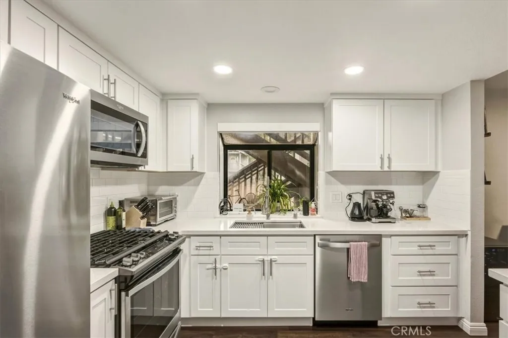 Welcome to this beautiful home in a highly sought-after neighborhood. This property features a newer owned Solar system for energy savings and newer energy-efficient windows, offering both comfort and sustainability. Very cozy and private end-unit with an inviting fireplace and private backyard with no neighbor to the back. This light and bright 2-bedroom, 2-bathroom condominium offering comfort, style, and thoughtful upgrades throughout. The beautifully updated kitchen features quartz countertops, shaker-style cabinetry, stainless steel appliances, and recessed lighting—perfect for both everyday living and entertaining. Enjoy durable plank flooring that flows seamlessly through the main living areas, along with upgraded bathrooms that provide a modern, refreshed feel. The spacious primary bedroom offers a relaxing retreat, complete with a private en-suite bathroom featuring dual sinks and two closets for ample storage. Additional highlights include an interior laundry area for convenience; dining area is open to the kitchen which has lots of counter space. Step outside to a private back patio with a dedicated storage area plus extra outdoor space to enjoy—with no neighbor directly behind for added privacy. This desirable end unit also includes a 2-car detached garage and offers exceptional community amenities, including a clubhouse, two pools, two spas, playground, and basketball court—making it a wonderful place to call home.