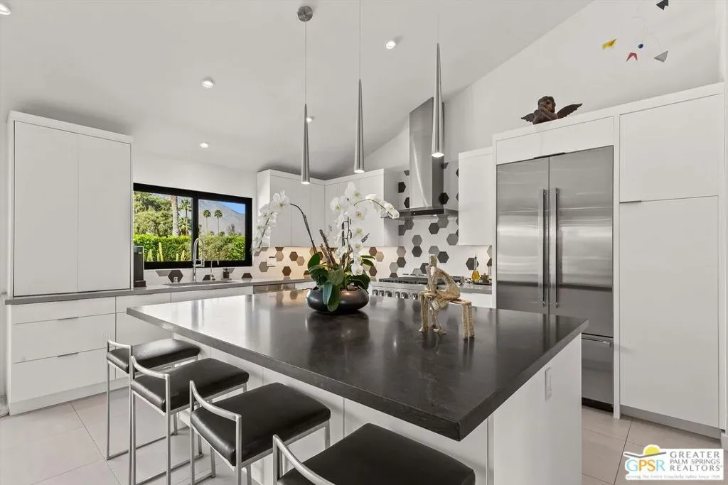 Located in the highly desirable Tahquitz Creek Golf neighborhood of South Palm Springs, this beautifully renovated home captures wide, unobstructed views of the western mountains and offers an exceptional sense of space, light, and indoor-outdoor living. With no power lines, direct golf course adjacency, and no HOA, the setting is both rare and remarkably open. The property has also been featured during Modernism Week home tours, highlighting its architectural appeal and thoughtful renovation.The residence is arranged in a U-shaped configuration, creating a seamless connection between the main living spaces and the backyard. The home features three en-suite bedrooms, one of which also functions as a powder room for guests in the main living areas an ideal layout for entertaining. A major renovation introduced new doors and windows, updated systems, and a fully reimagined kitchen that opens effortlessly to the living and dining areas. The kitchen is centered around a striking island and finished with crisp black-and-white detailing, complemented by curated art lighting throughout the home.Two fireplaces add warmth and architectural interest. One in the main living room sitting area and another in the primary suite, which also features a walk-in closet and excellent separation from the guest rooms.In addition to the three bedrooms, the home includes two dedicated office spaces, offering flexibility for work, creative pursuits, or a sitting room off one of the guest suites.At approximately 2,750 square feet, the home delivers a sophisticated yet relaxed living environment with strong sight lines, abundant natural light, and a seamless relationship to the outdoors.The backyard has been fully reimagined with new hardscape and landscaping and features a beautiful pool and spa, an outdoor barbecue and entertaining area, and generous depth backing directly to the golf course and framed by the dramatic western mountain backdrop.